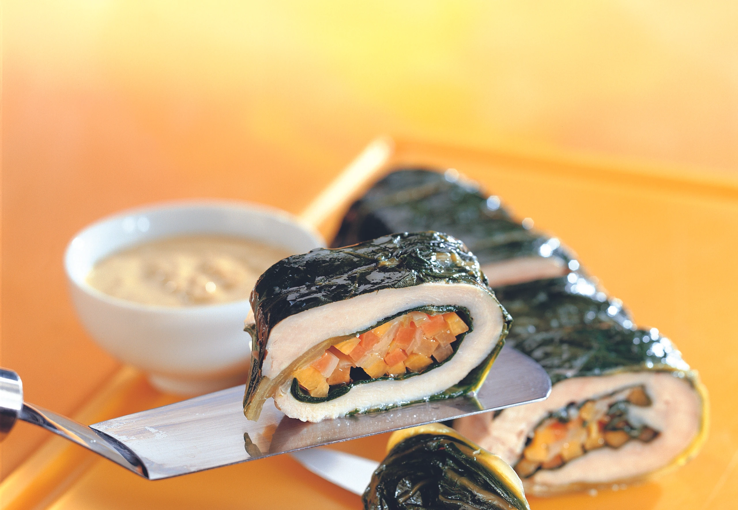 Frischhaltefolie glatt auflegen. 7 Mangoldblätter nebeneinander in Form eines Rechtecks auflegen. Filets darauf legen, salzen und pfeffern. Übrigen Mangold darauf legen und mit Gemüsestreifen belegen. Mangold mit Hilfe der Folie über die Fülle eng einrollen. Rolle in Frischhalte-, dann in Alufolie wickeln, Enden eindrehen.