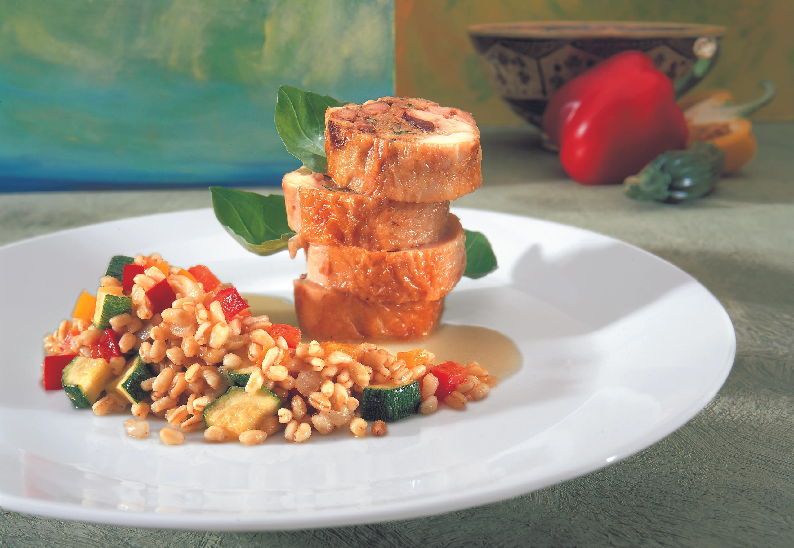 Hühnerkeule mit Leberfüllung auf Zartweizen-Gemüse