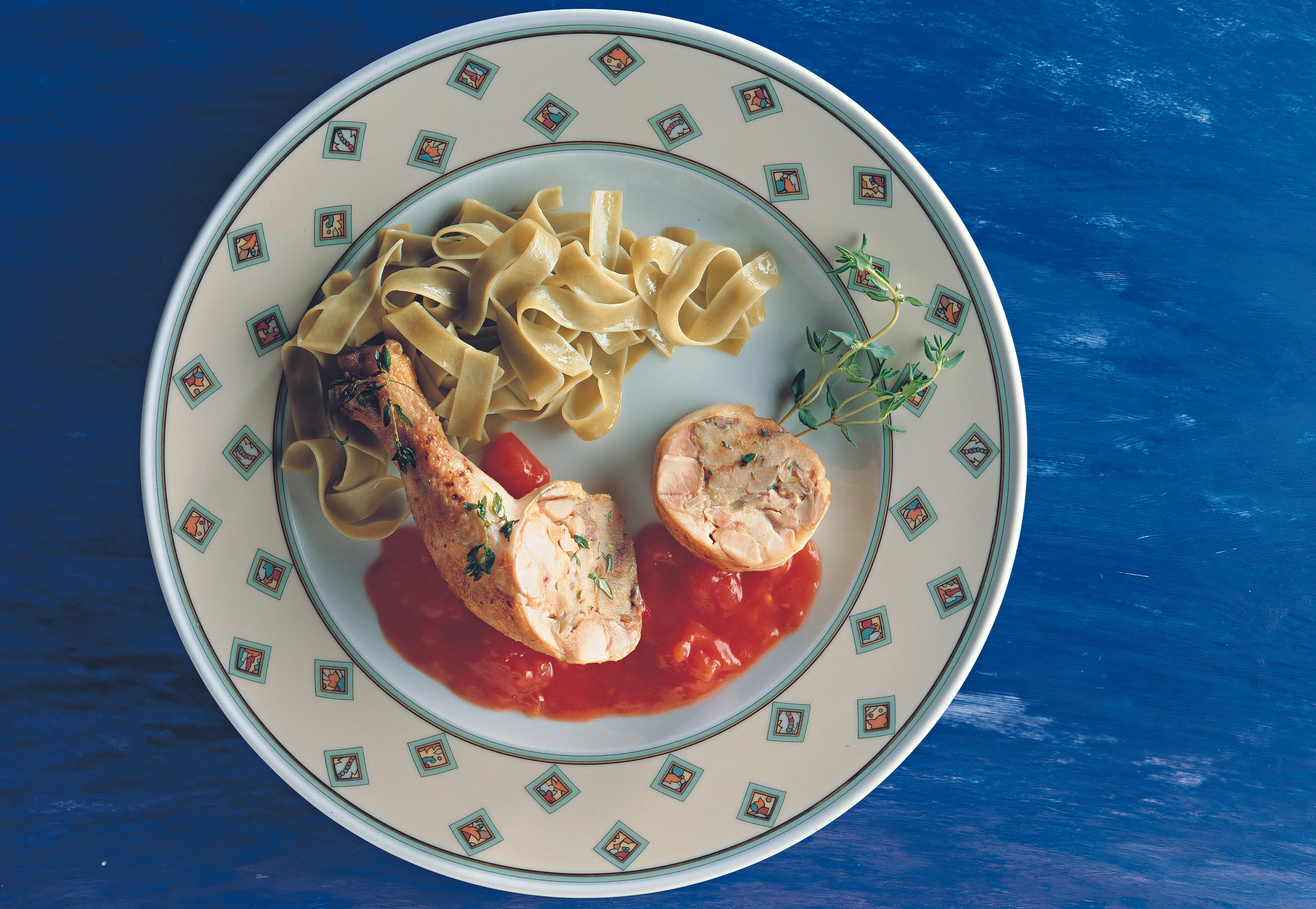 - Hühnerkeulen enthäuten und auflegen. Die oberen Keulenknochen mit einem scharfen Messer behutsam auslösen, den dadurch entstandenen Hohlraum mit Brotmasse füllen, Keulenfleisch darüberschlagen.