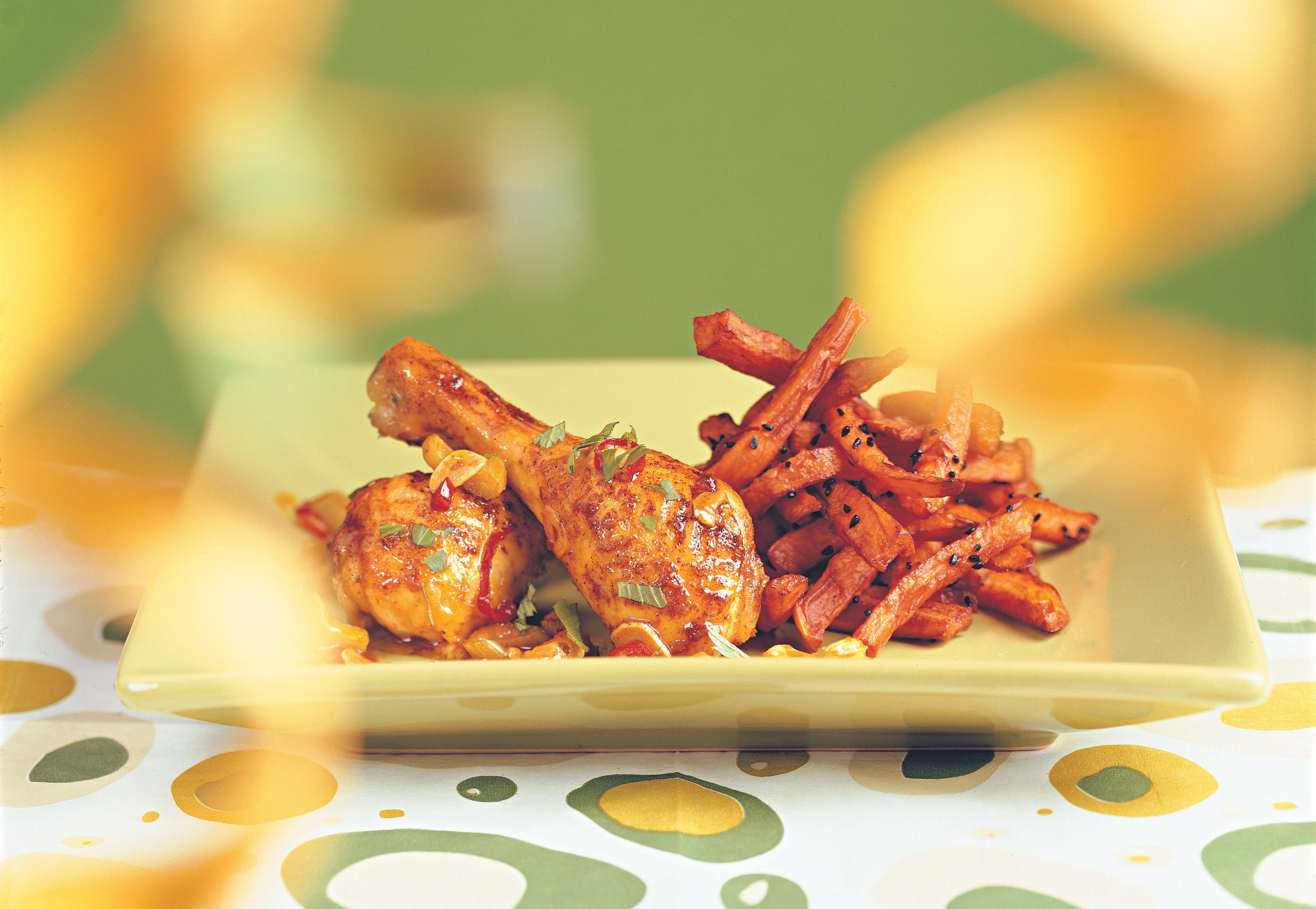 Hühnerkeulen mit knusprigen Süßkartoffeln