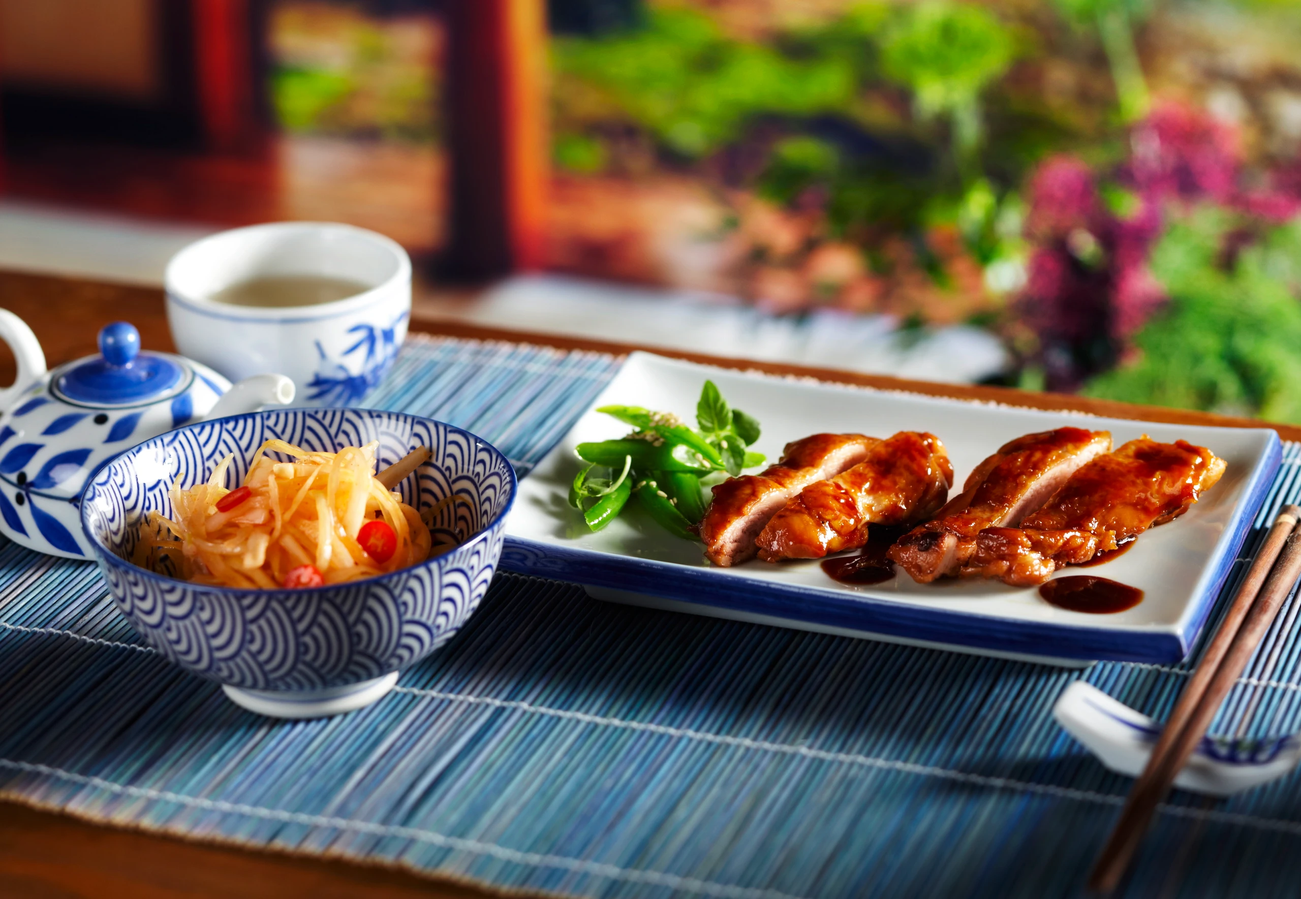 Hühnerkeulen-Teriyaki mit Fisolen und Shio-Momi-Krautsalat