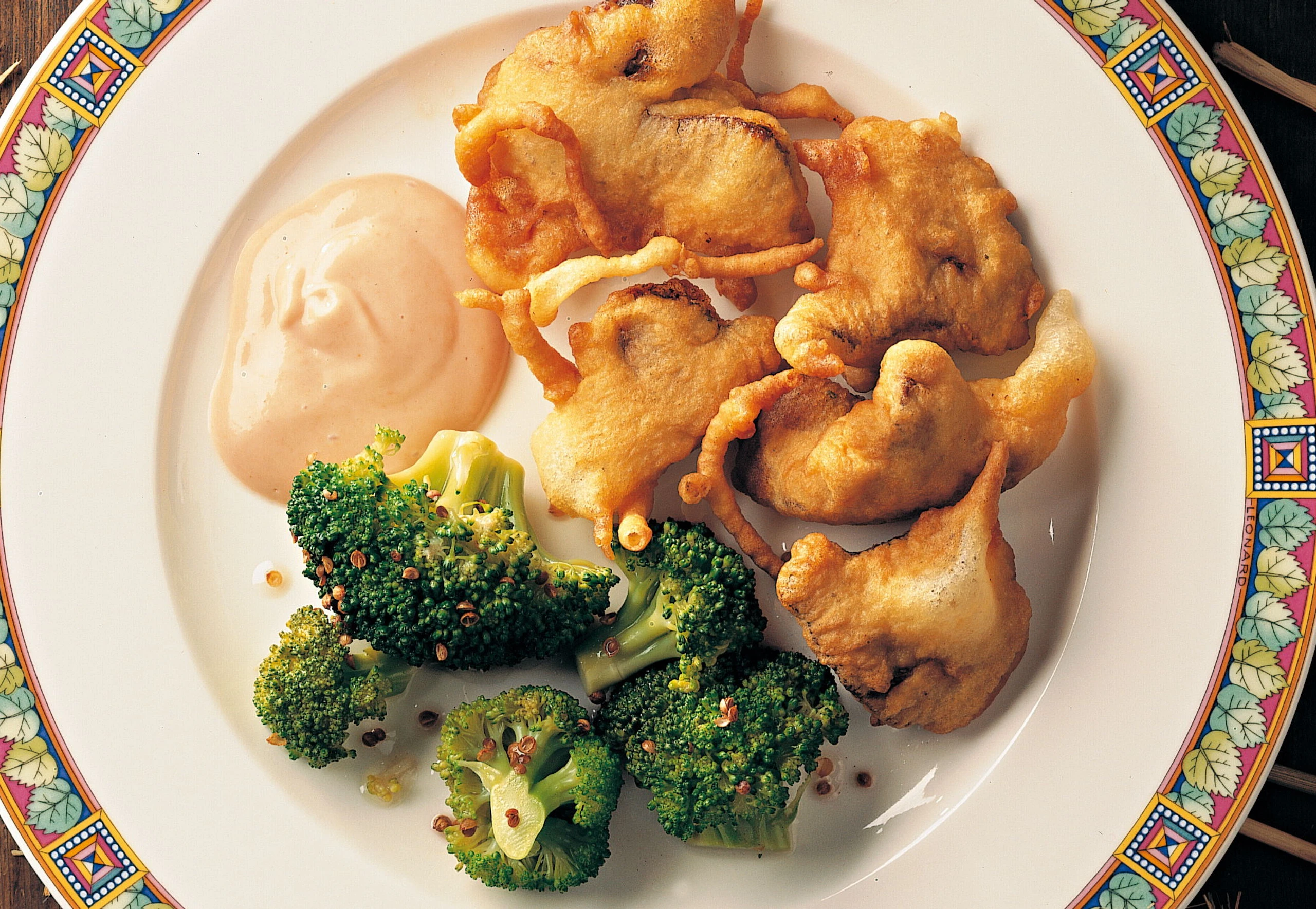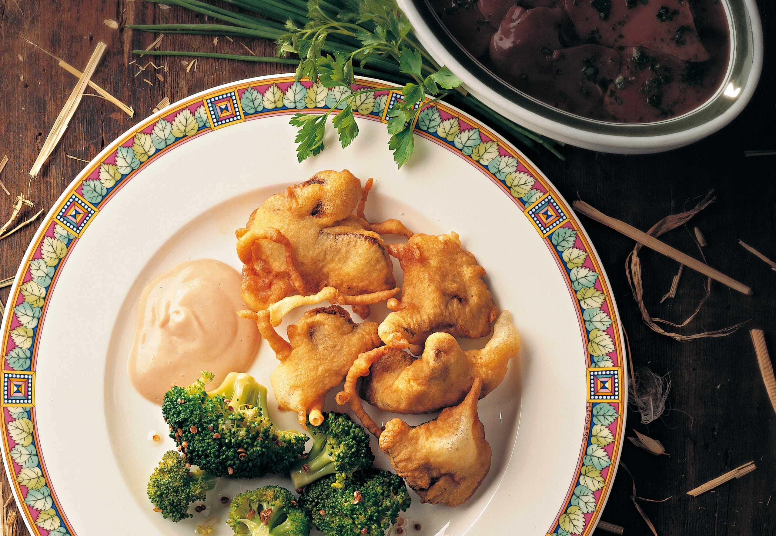 Die Hühnerlebern einzeln durch den Backteig ziehen, in heißem Fett goldgelb bakken, auf Küchenpapier gut abtropfen lassen und auf Tellern anrichten.