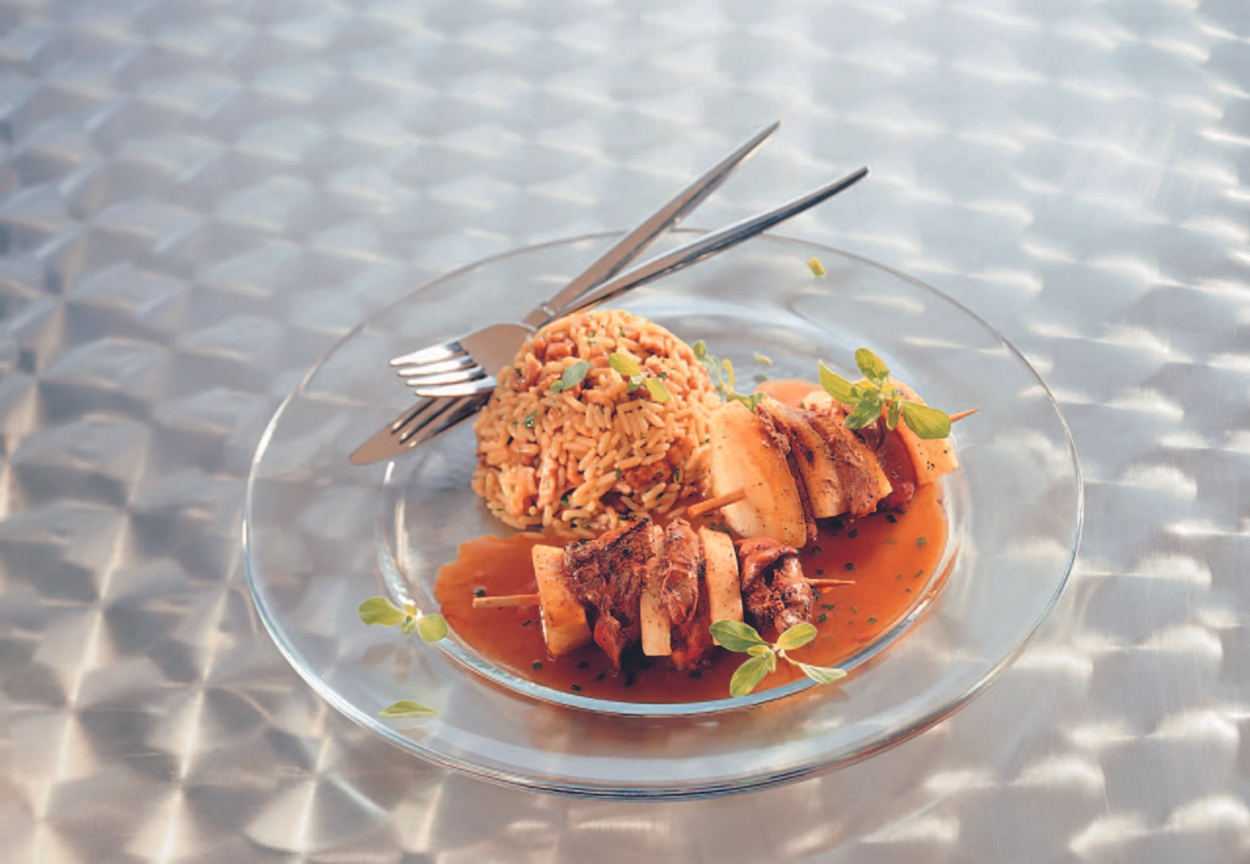 Bratrückstand mit Bier ablöschen, mit Bratensaft aufgießen und aufkochen. Schnittlauch einrühren. Spieße mit der Sauce und dem Reis servieren.
