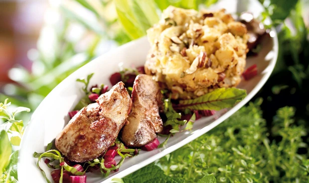 Leber und Schalotten im Öl anrösten, Wein und Sherry zugießen und köcheln. Leber mit Mangold und Auflauf servieren.