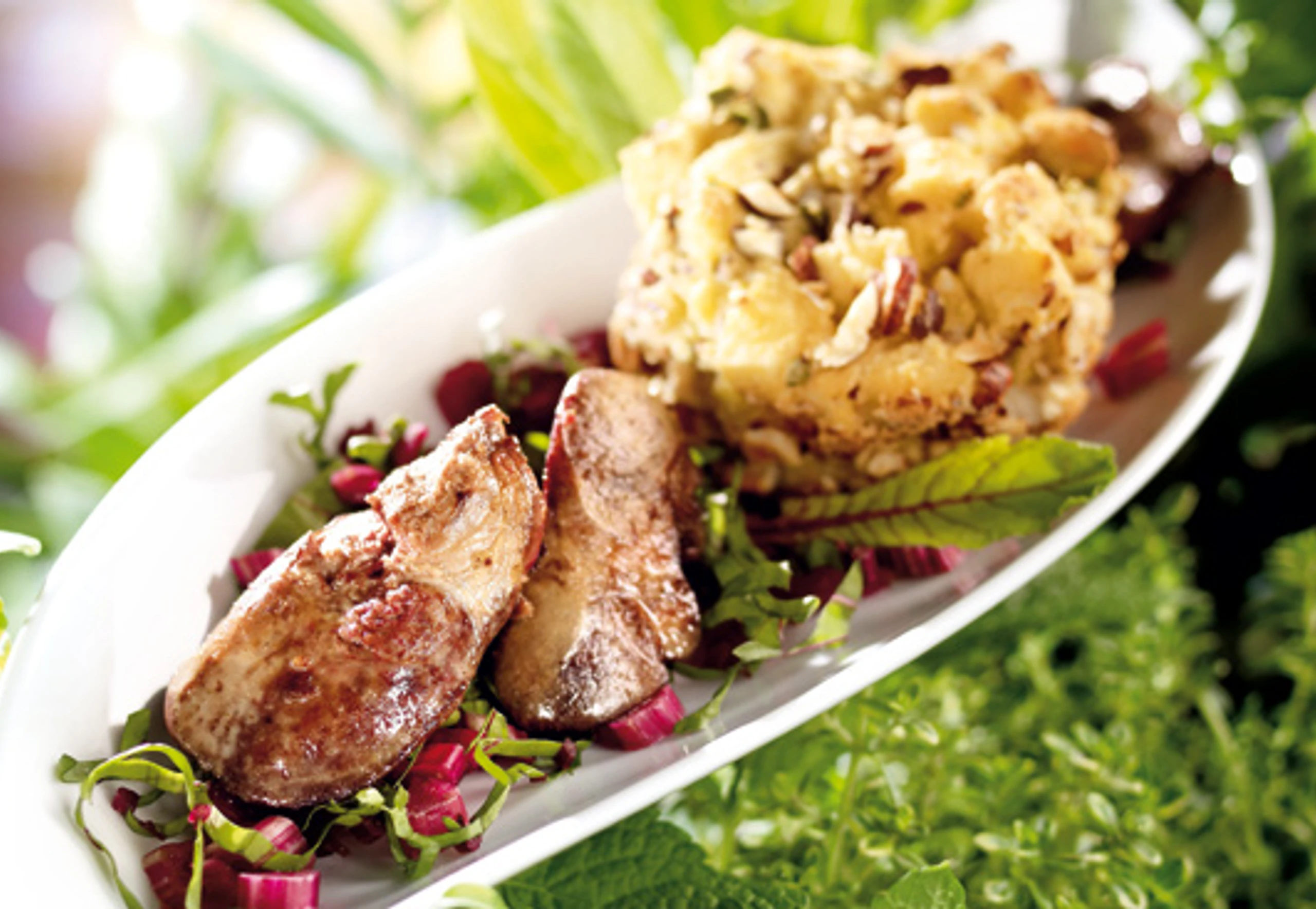 - Leber und Schalotten im Öl anrösten, Wein und Sherry zugießen und köcheln. Leber mit Mangold und Auflauf servieren.