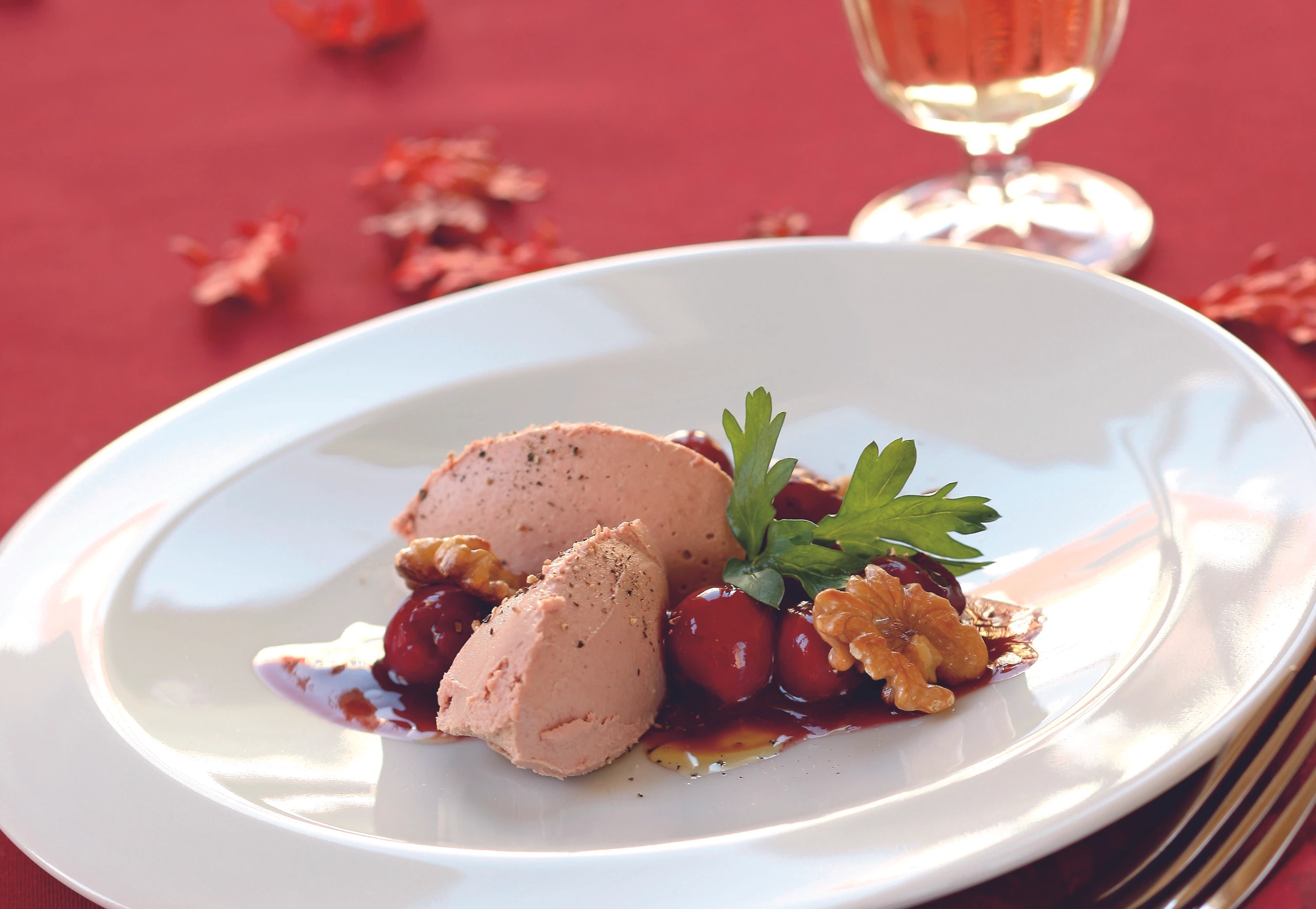 Für die Kirschen Portwein auf die Hälfte einkochen, Butter und Öl zugeben und mixen. Kirschen unterrühren, salzen und pfeffern.