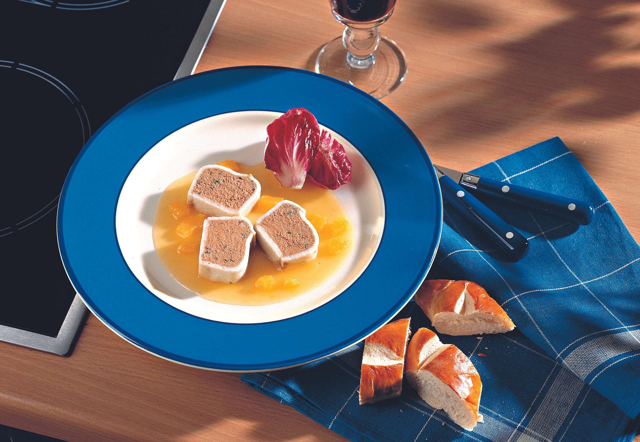 Lebermasse einfüllen, überstehenden Speck darüber legen. Die Form in ein passendes Geschirr (am besten Bratenpfanne aus Metall) stellen und so viel kochendes Wasser zugießen, daß sie halbhoch im Wasserbad steht. Terrine im vorgeheizten Rohr (mittlere Schiene / Gitterrost) knapp unter dem Siedepunkt garziehen lassen (ca. 1 Stunde). Terrine aus dem Rohr nehmen, beschweren und mindestens 10 Stunden kühlen.Terrine aus der Form stürzen, in nicht zu dünne Scheiben schneiden, anrichten und mit zart mariniertem Radicchiosalat garnieren.