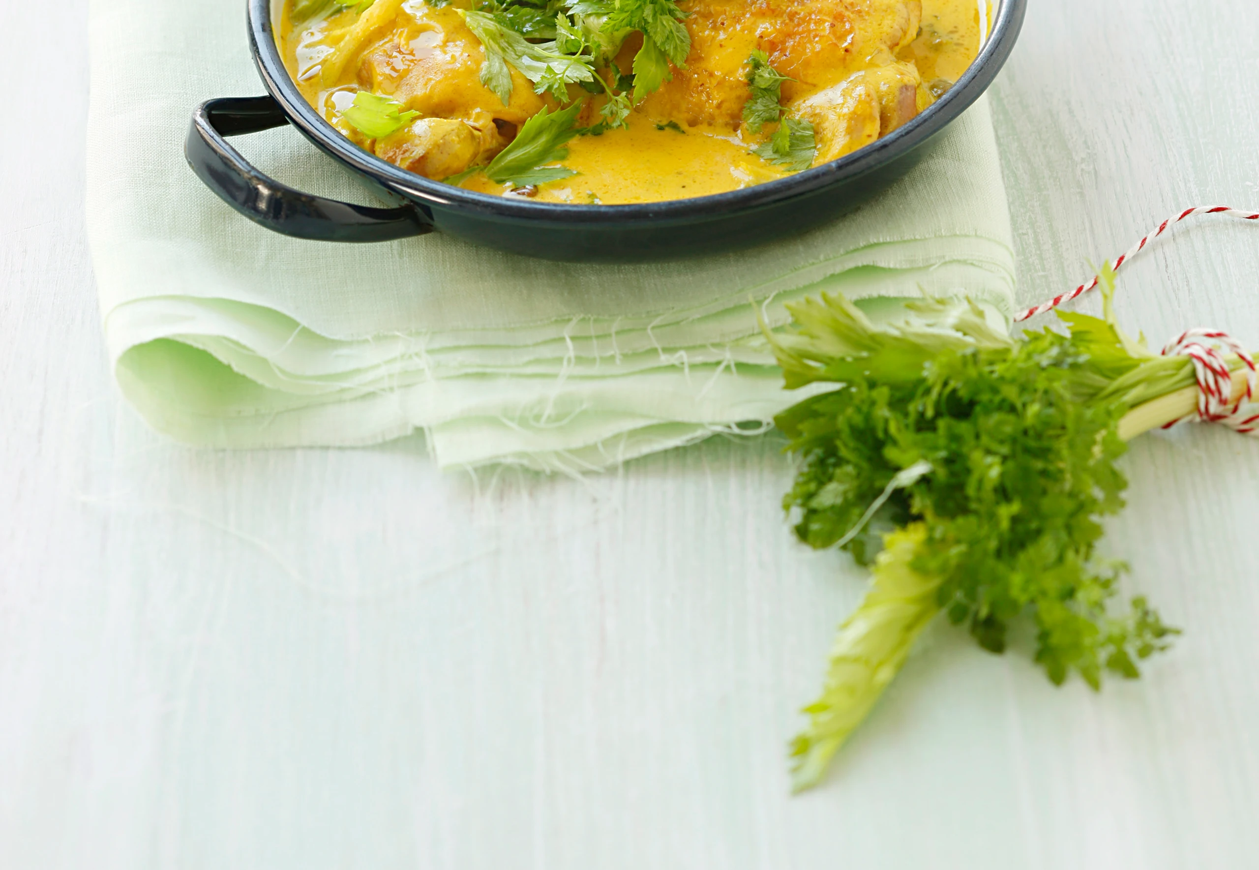 Von den Kräutern die Blättchen abzupfen, fein hacken. Kräuter, Crème fraîche, Senf, Kurkuma und Speisestärke vermischen. Topf aus dem Rohr nehmen, Creme in die Sauce rühren. Sellerie und Kapern auf die Keulen legen. Ragout im Rohr (mittlere Schiene / Gitterrost) fertig garen (ca. 15 Minuten).