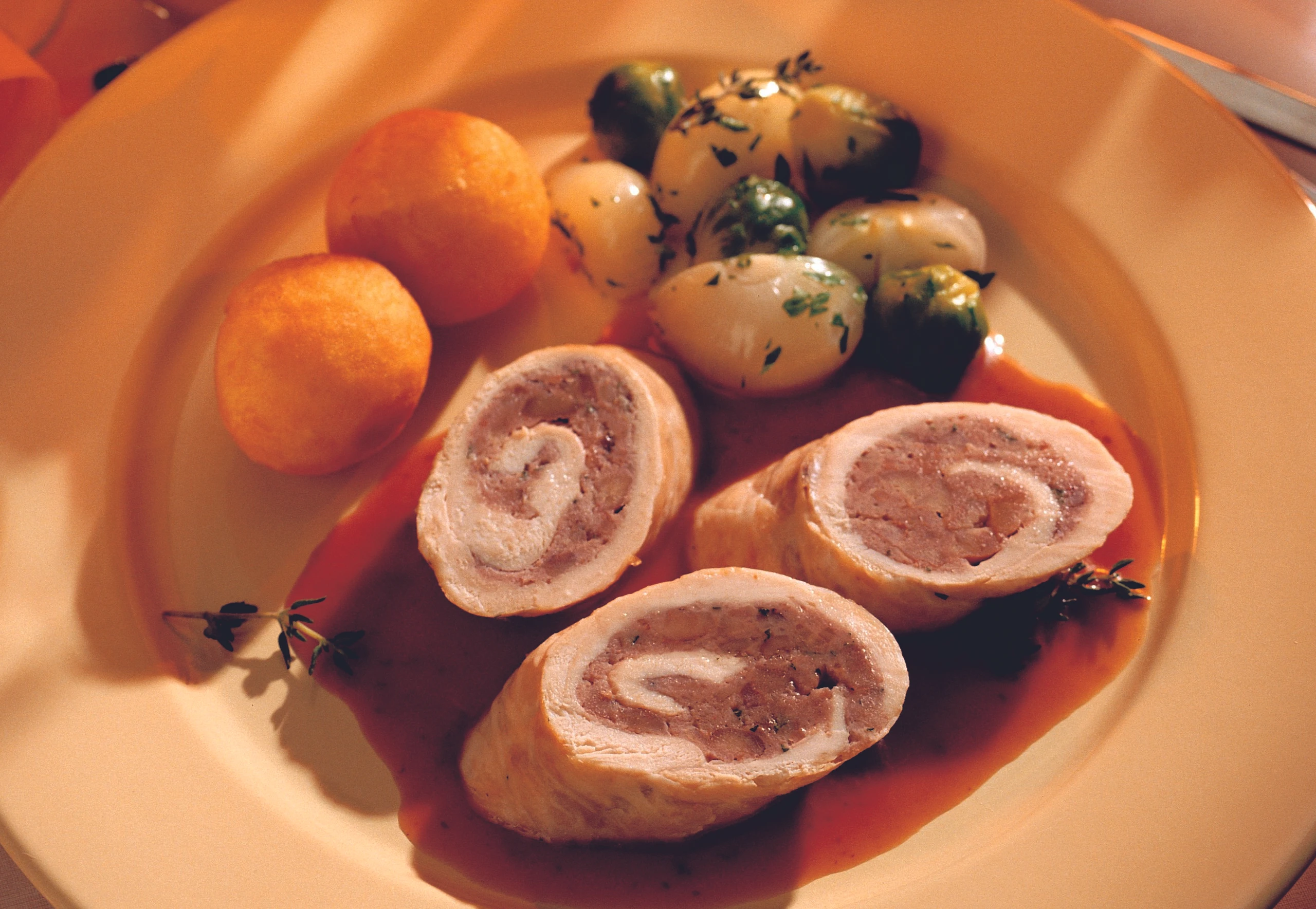 Rouladen in der Sauce erwärmen, vor dem Servieren in Scheiben schneiden und mit der Sauce anrichten.