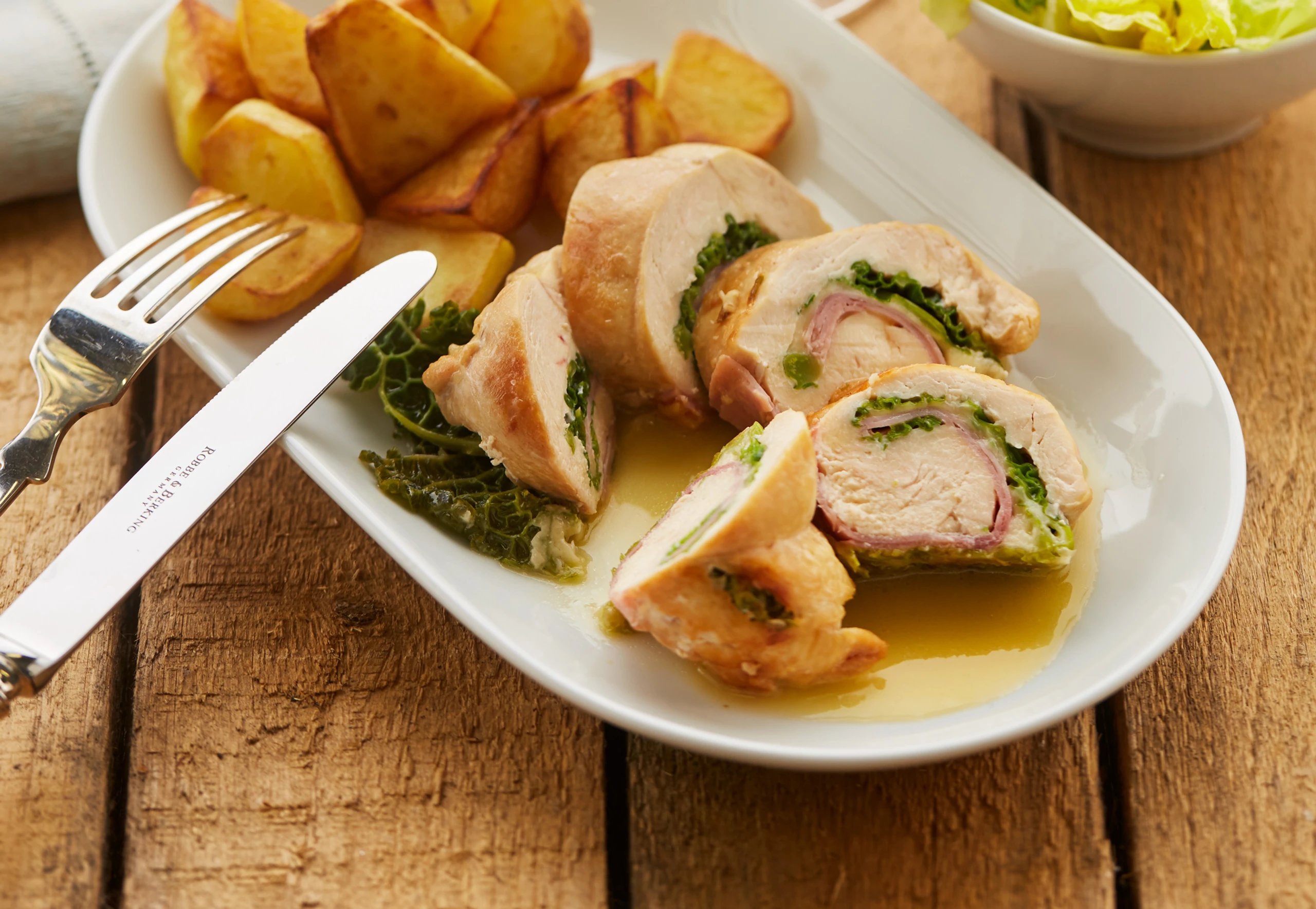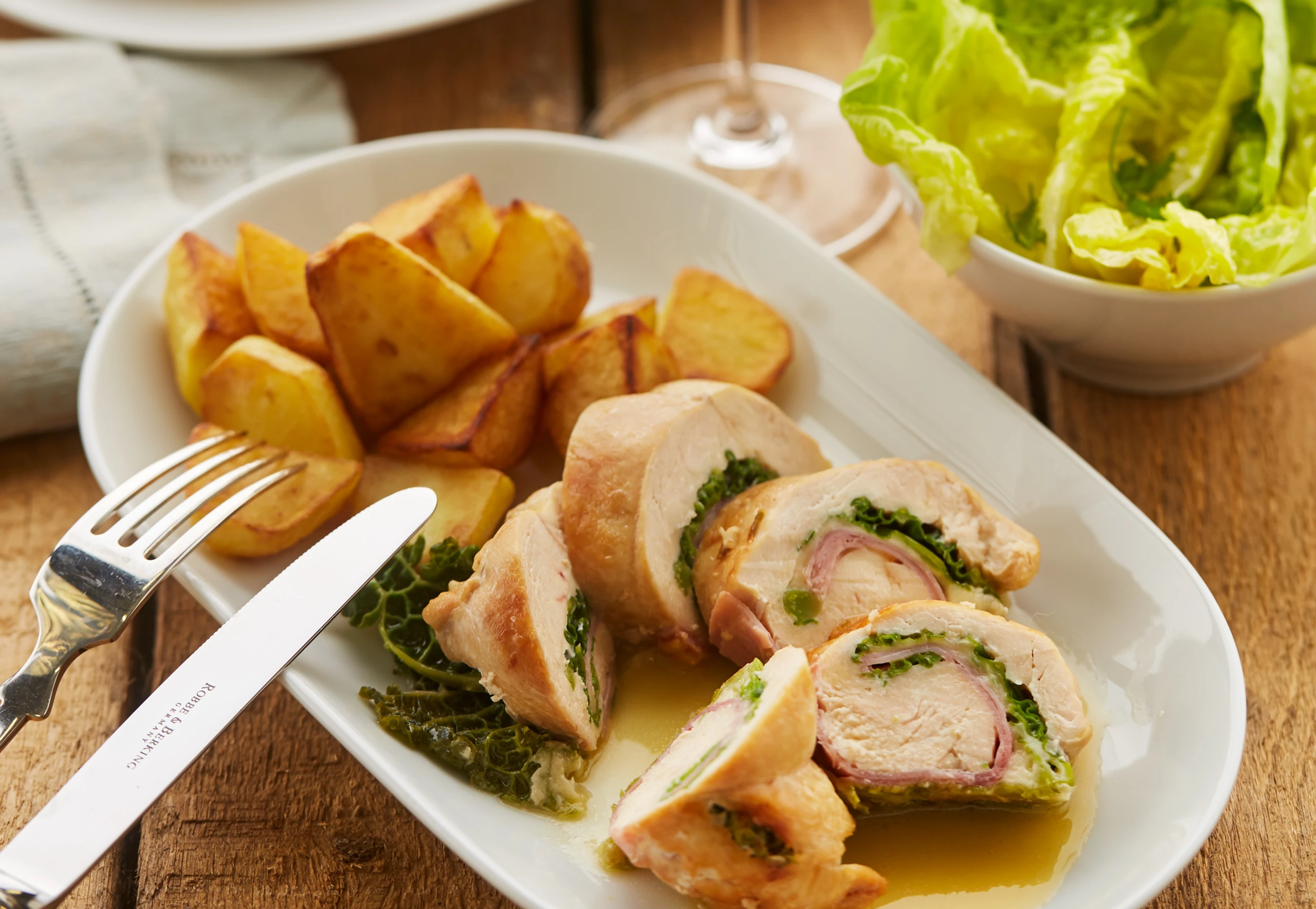 Rohr auf 180°C vorheizen. Hühnerfilets an den Seiten einschneiden. Fleisch aufklappen, zwischen Frischhaltefolie behutsam klopfen und mit Salz und Pfeffer würzen. Jedes Schnitzel mit 1 Kohlblatt und je 2 Käse- und 2 Schinkenscheiben belegen. Schnitzel eng einrollen, mit Spagat binden und mit Salz und Pfeffer würzen.