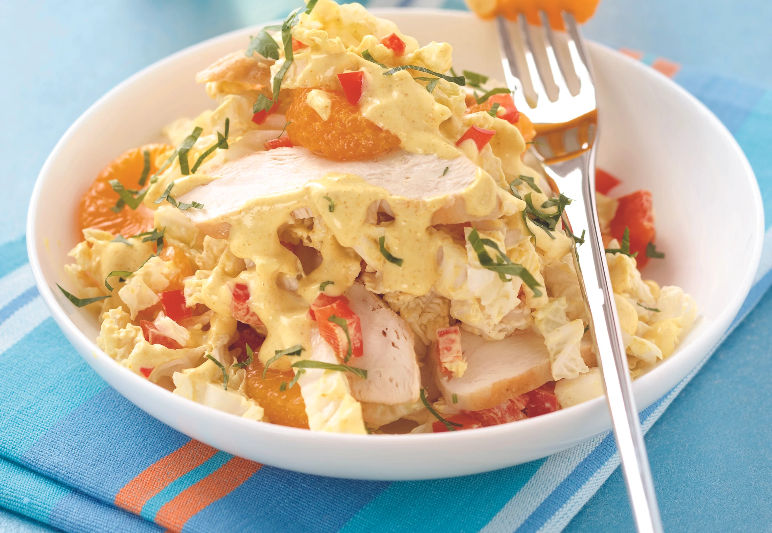 Für die Marinade Mayonnaise, Sauerrahm und Curry verrühren. Mandarinen, Paprika, Chinakohl und Hühnerfilets untermischen. Salat mit Salz und Pfeffer würzen und mit Petersilie garniert servieren.