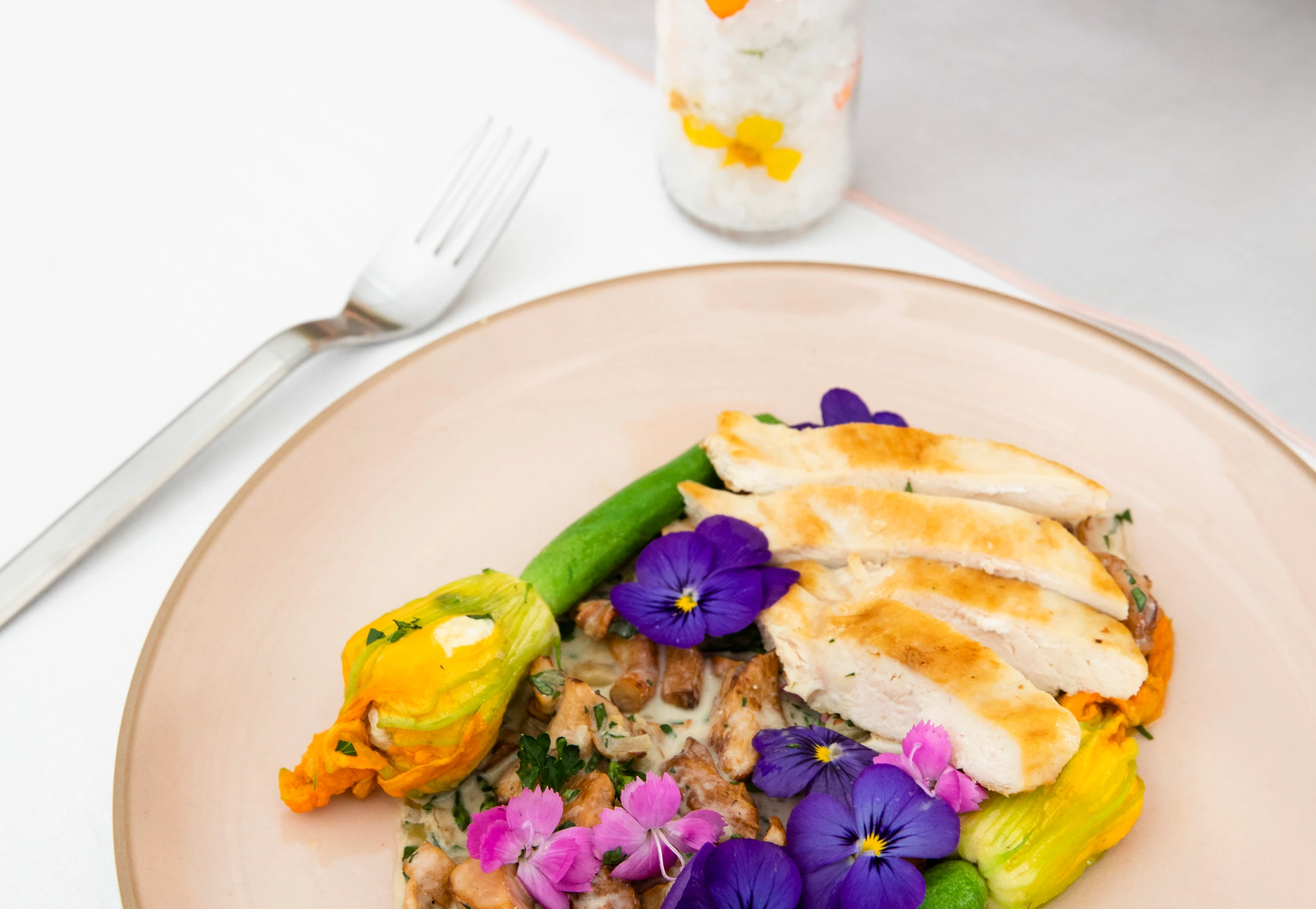 Suppe mit Butter aufkochen. Zucchiniblüten einlegen und ca. 8 Minuten dünsten. Nelken und Veilchen verlesen. Schnitzel mit Sauce und Zucchiniblüten anrichten und mit Blüten garniert servieren.