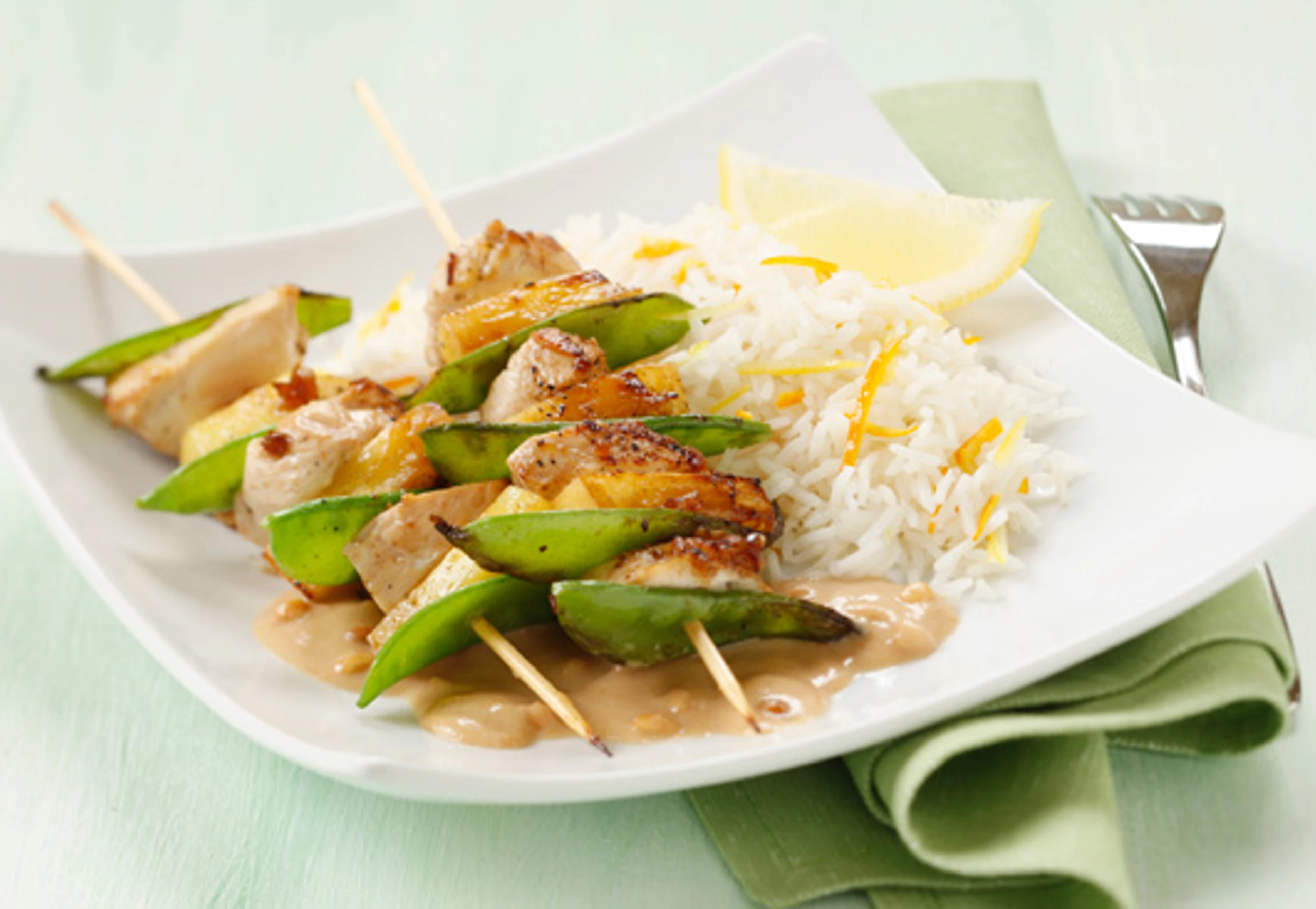 Hühnerspießchen mit Ananas und Zitrus-Reis