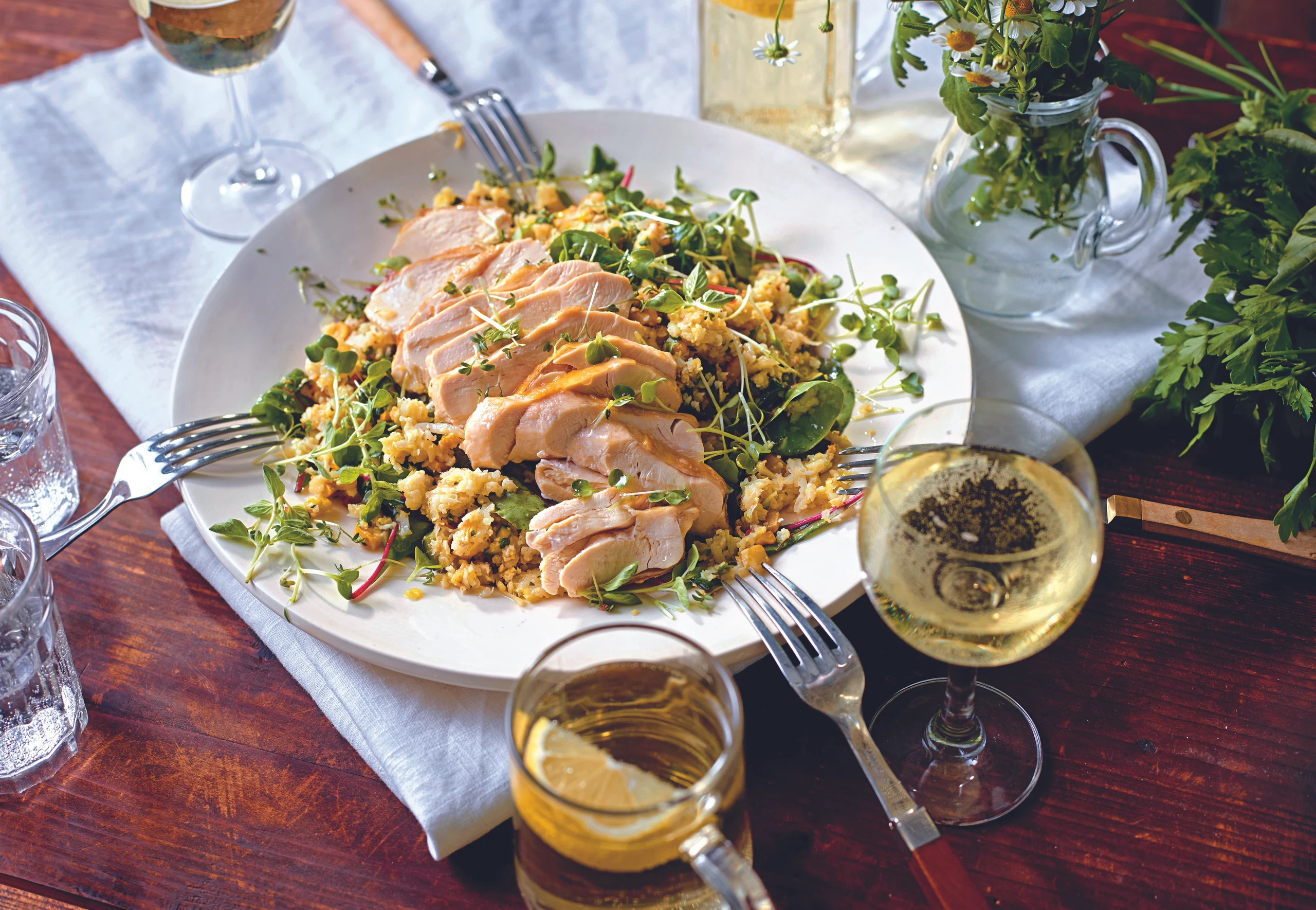 Hühnerfilets in dünne Längsstreifen schneiden. Karfiol, Zucchini, Mangold und die Marinade vermischen, mit den Hühnerstreifen anrichten und mit Kresse und Majoran bestreut servieren.