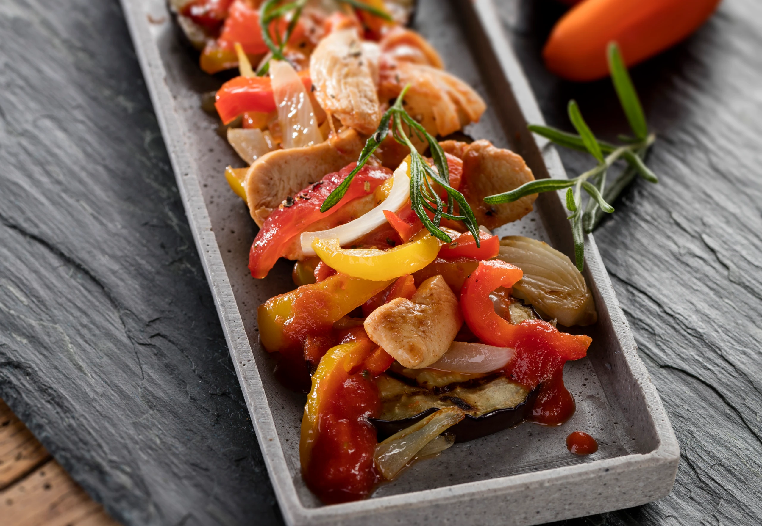 Hühnerstreifen mit Paradeiser-Paprikagemüse