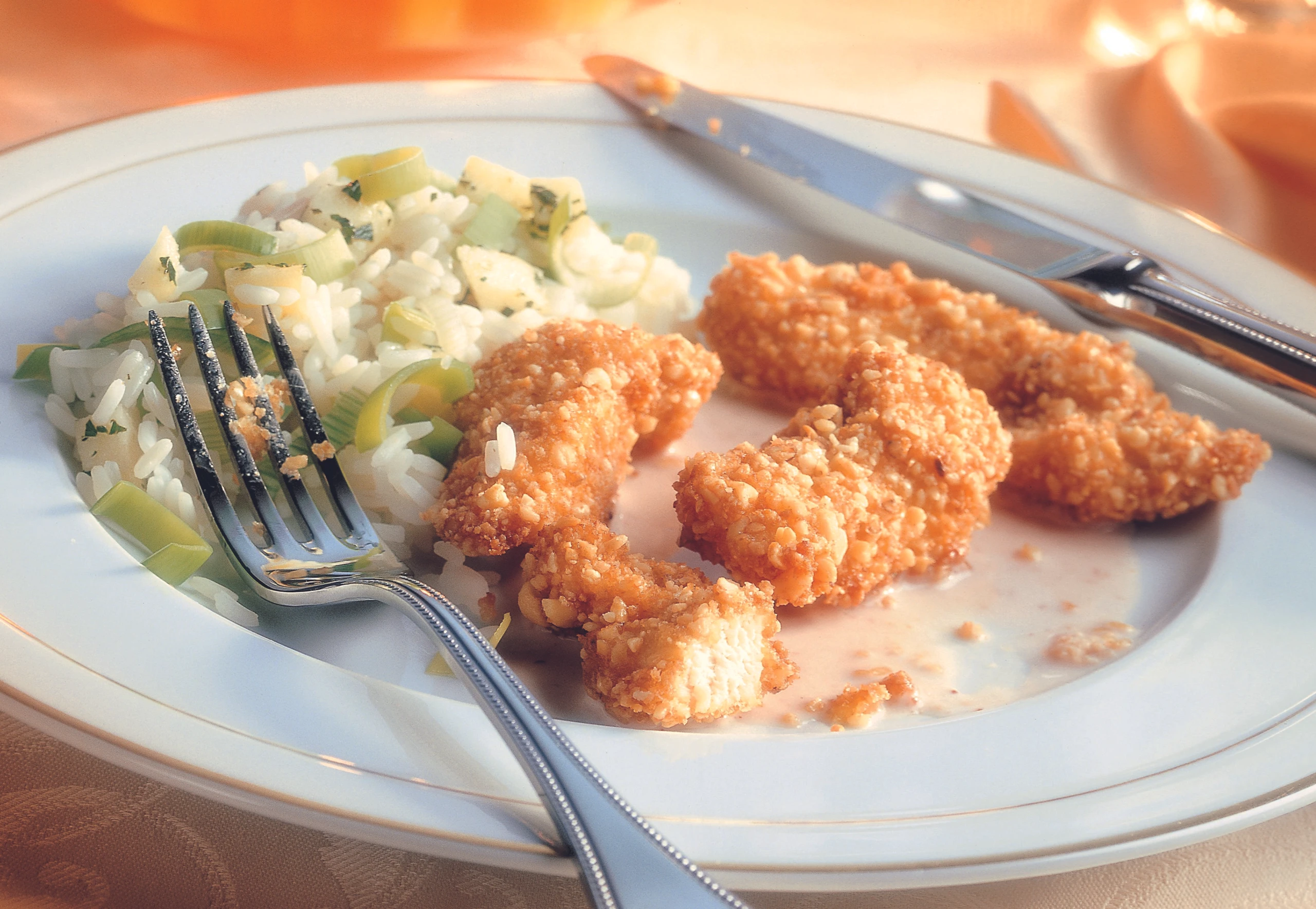 In einer Pfanne ca. 2 Finger hoch Öl erhitzen. Hühnerstreifen darin, am besten in 2–3 Arbeitsgängen, goldgelb backen. Hühnerstreifen mit einem Siebschöpfer aus der Pfanne heben, auf Küchenpapier gut abtropfen lassen und im vorgeheizten Rohr warm stellen. Sauce erwärmen und mit den Hühnerstreifen und dem Reis anrichten.