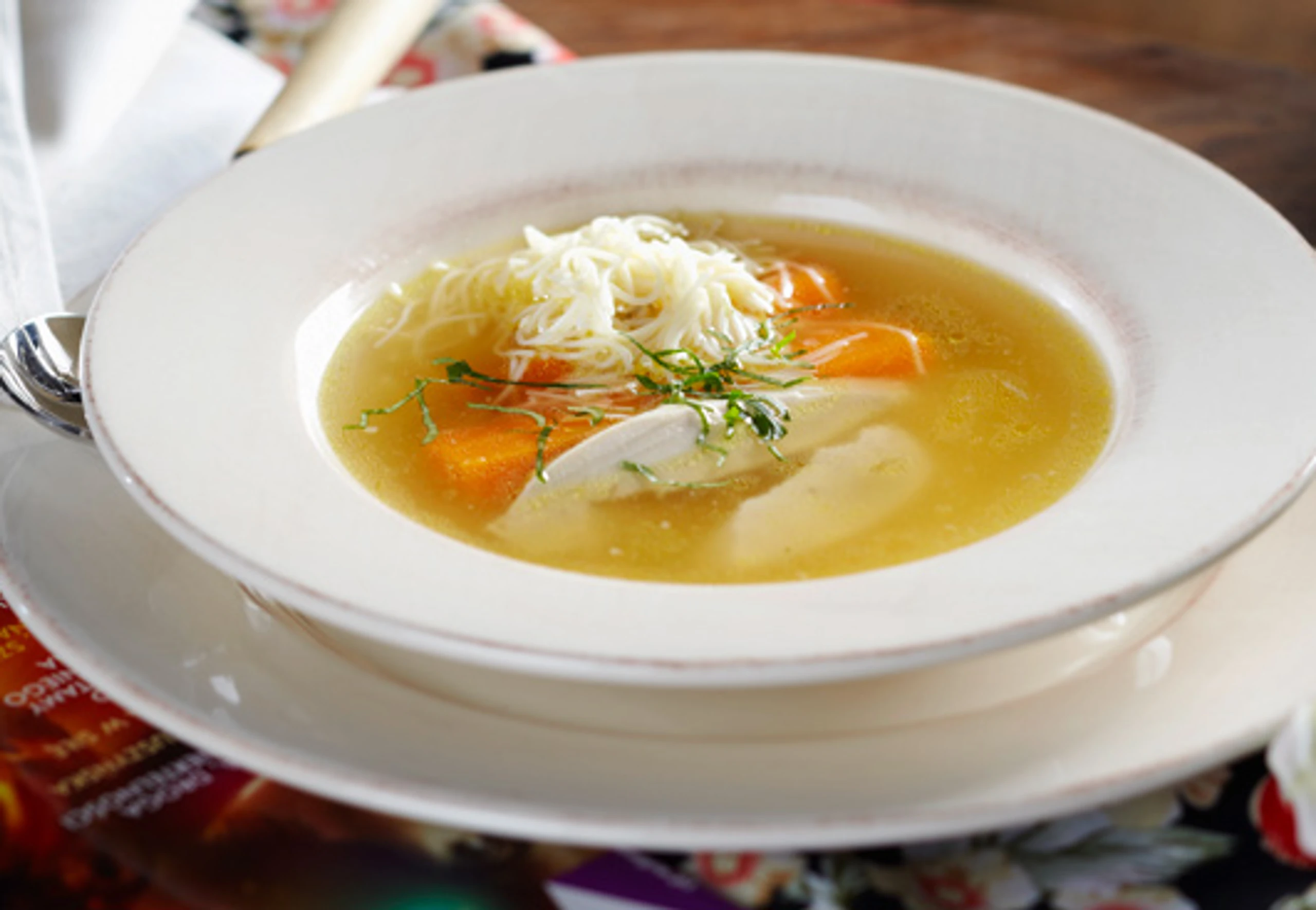 - Karotten putzen, schälen, quer und längs halbieren. Suppe abseihen, aufkochen, Karotten und Brüste zugeben und ca. 20 Minuten köcheln. Nudeln zugeben, Suppe weitere 5 Minuten köcheln. Brüste herausnehmen und längs dritteln.