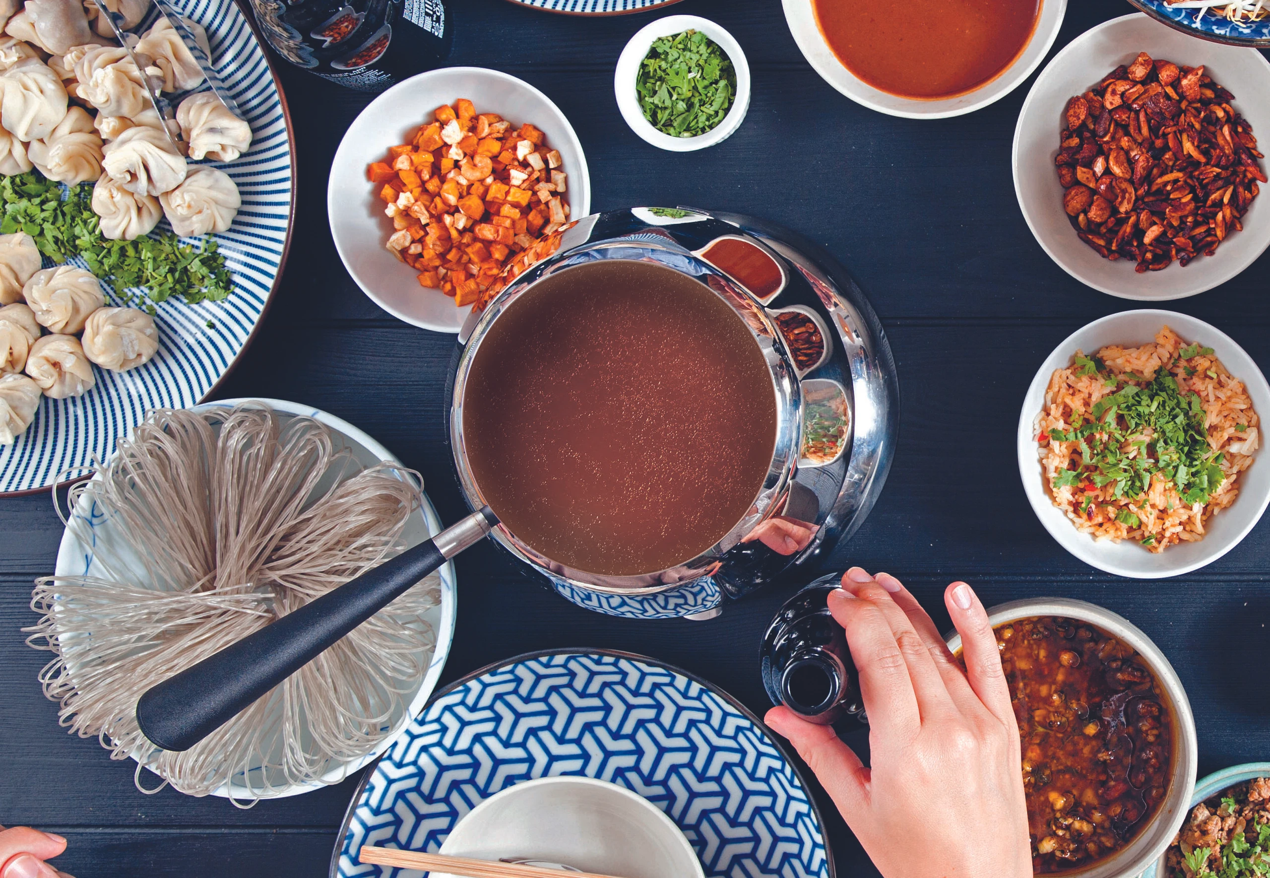 Diese Suppe eignet sich sehr gut für Hotpots. Als Einlage passen zum Beispiel in Streifen geschnittenes Rindfleisch, in Fasern zerteiltes Fleisch vom Suppenhuhn, Garnelen, Surimi, Maiskölbchen, Sprossen, Champignons, Karottenstifte, Lauchringe und asiatische Nudeln.Aus dem Heft: