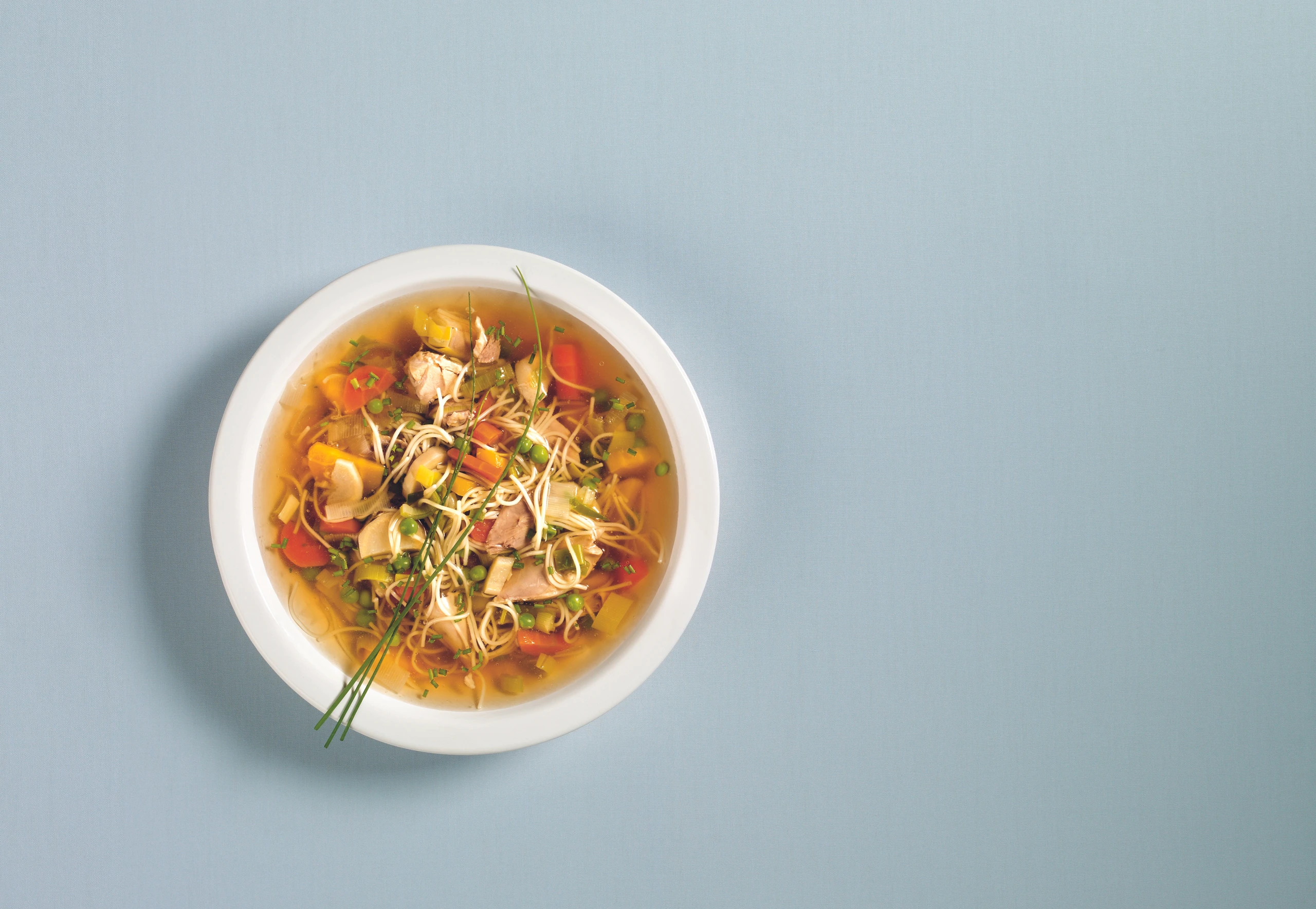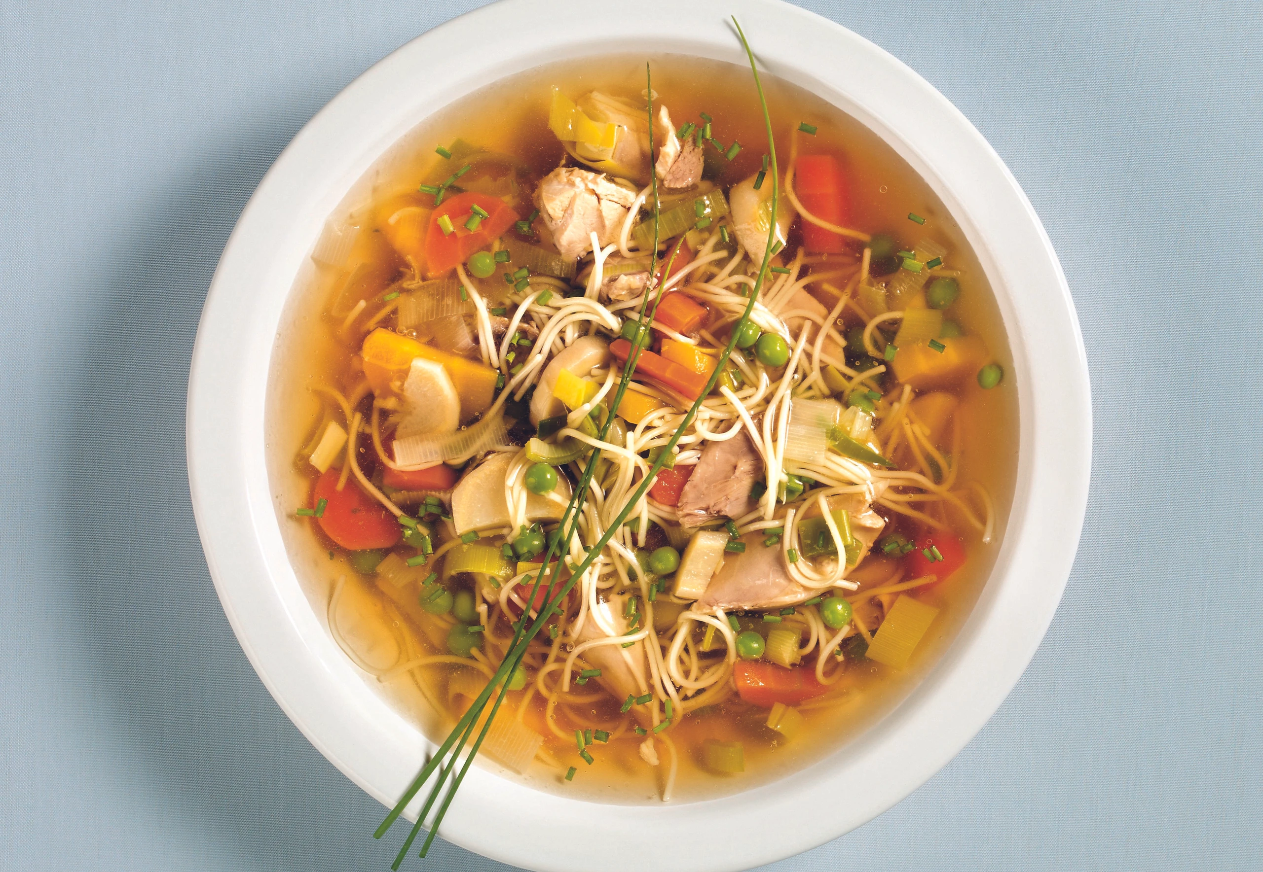Hühnerfleisch von den Knochen lösen und in Stücke schneiden. Fleisch und Nudeln in die Suppe geben und darin erwärmen. Suppe mit Salz und Pfeffer würzen und mit Schnittlauch bestreut servieren.