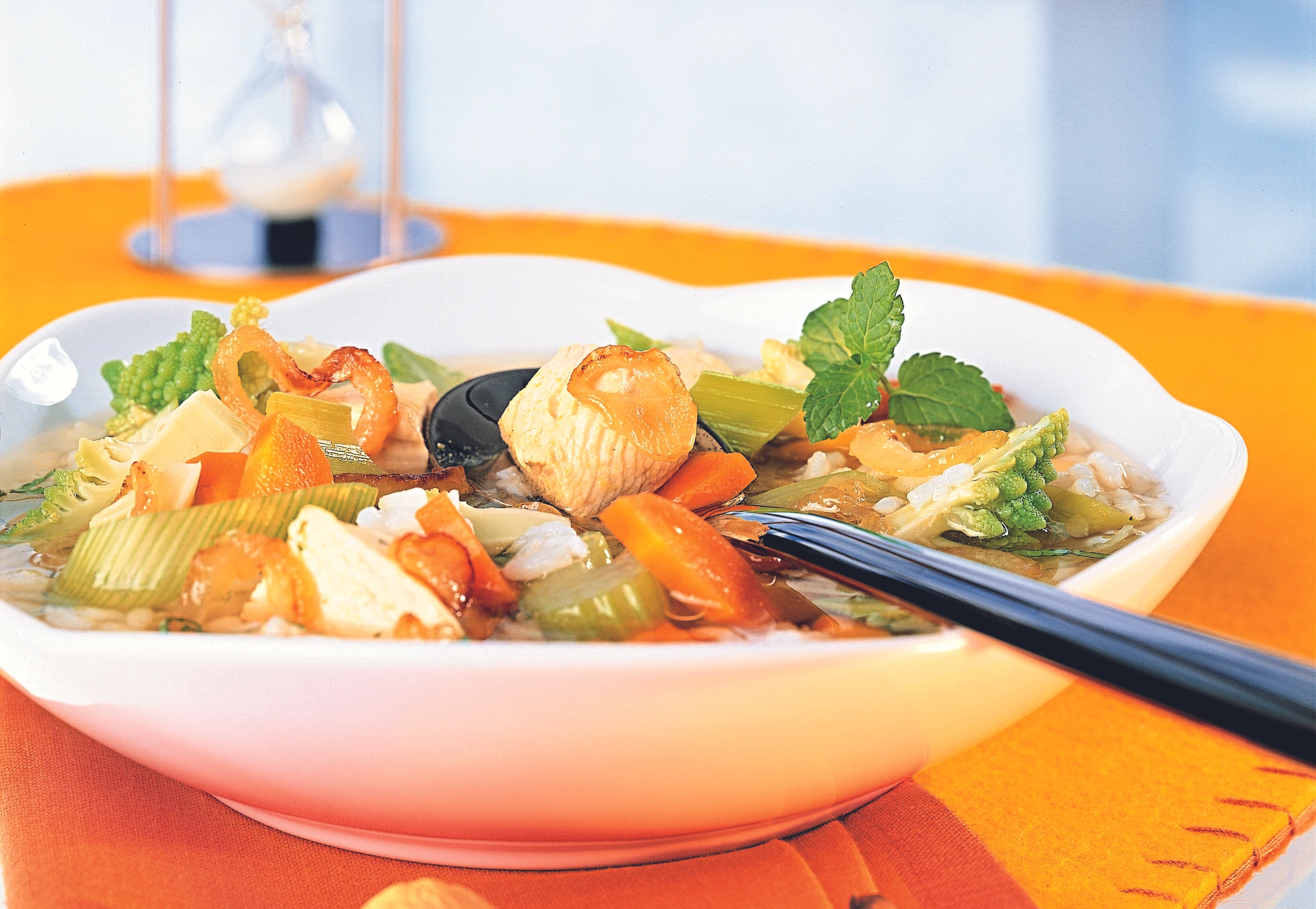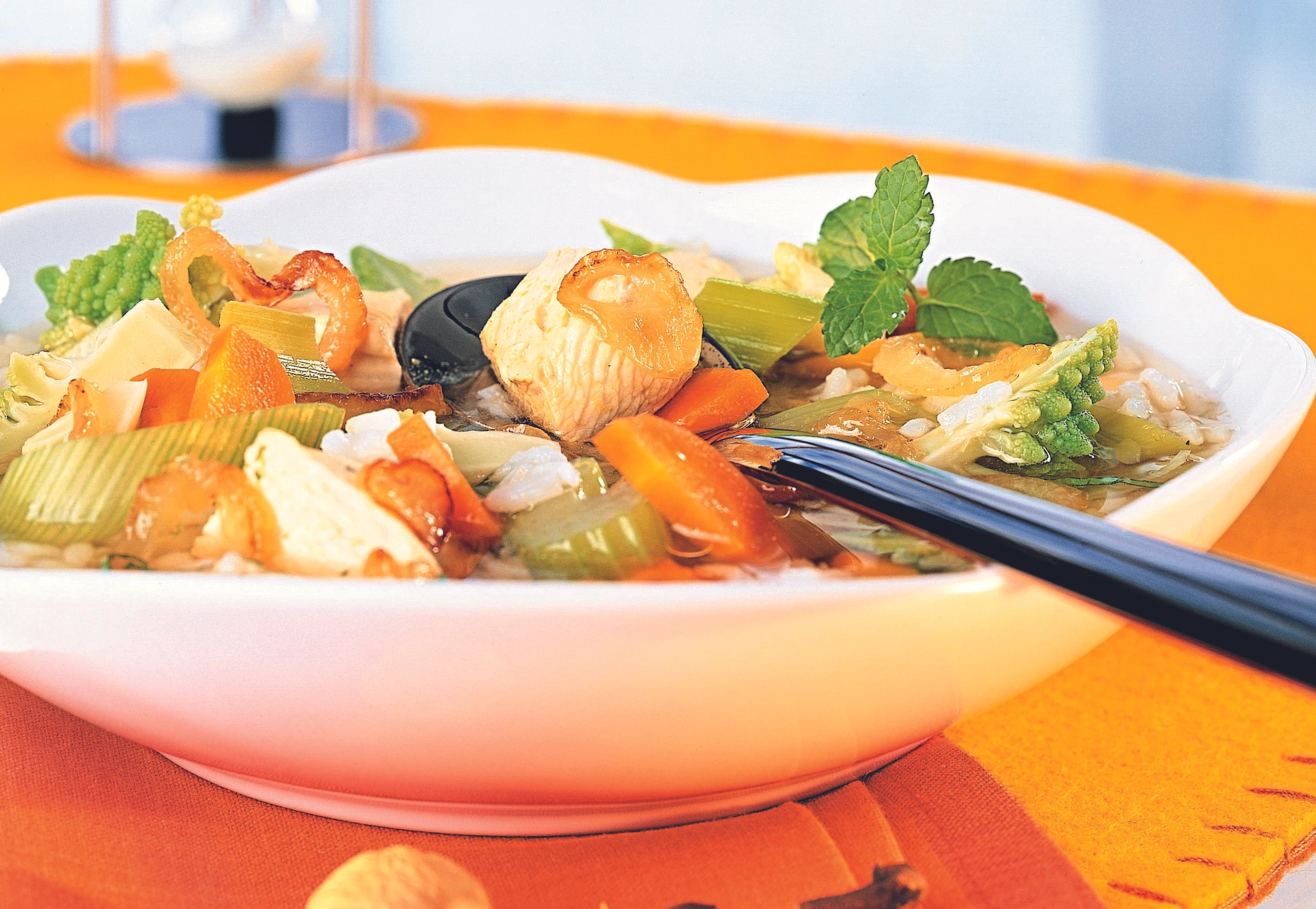 Inzwischen Hühnerfleisch in 1,5 cm große Würfel schneiden. Zwiebel in feine Ringe, Karotte und Sellerie in dünne Scheiben schneiden. Lauch längs halbieren und quer in dünne Streifen schneiden. Romanesco in Röschen teilen.