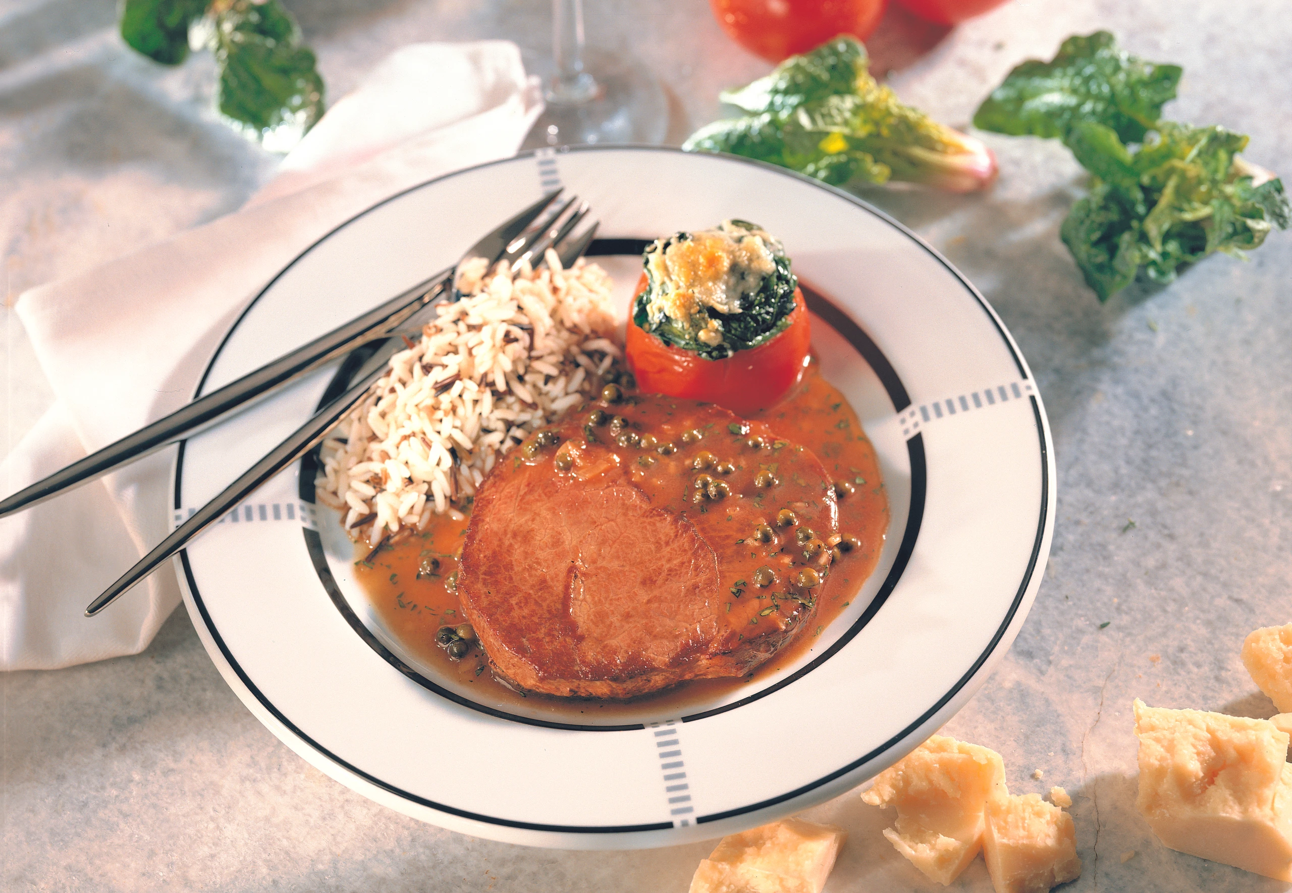 Hüftsteak mit Pfeffersauce, gemischtem Reis und Paradeisern mit Spinatfülle