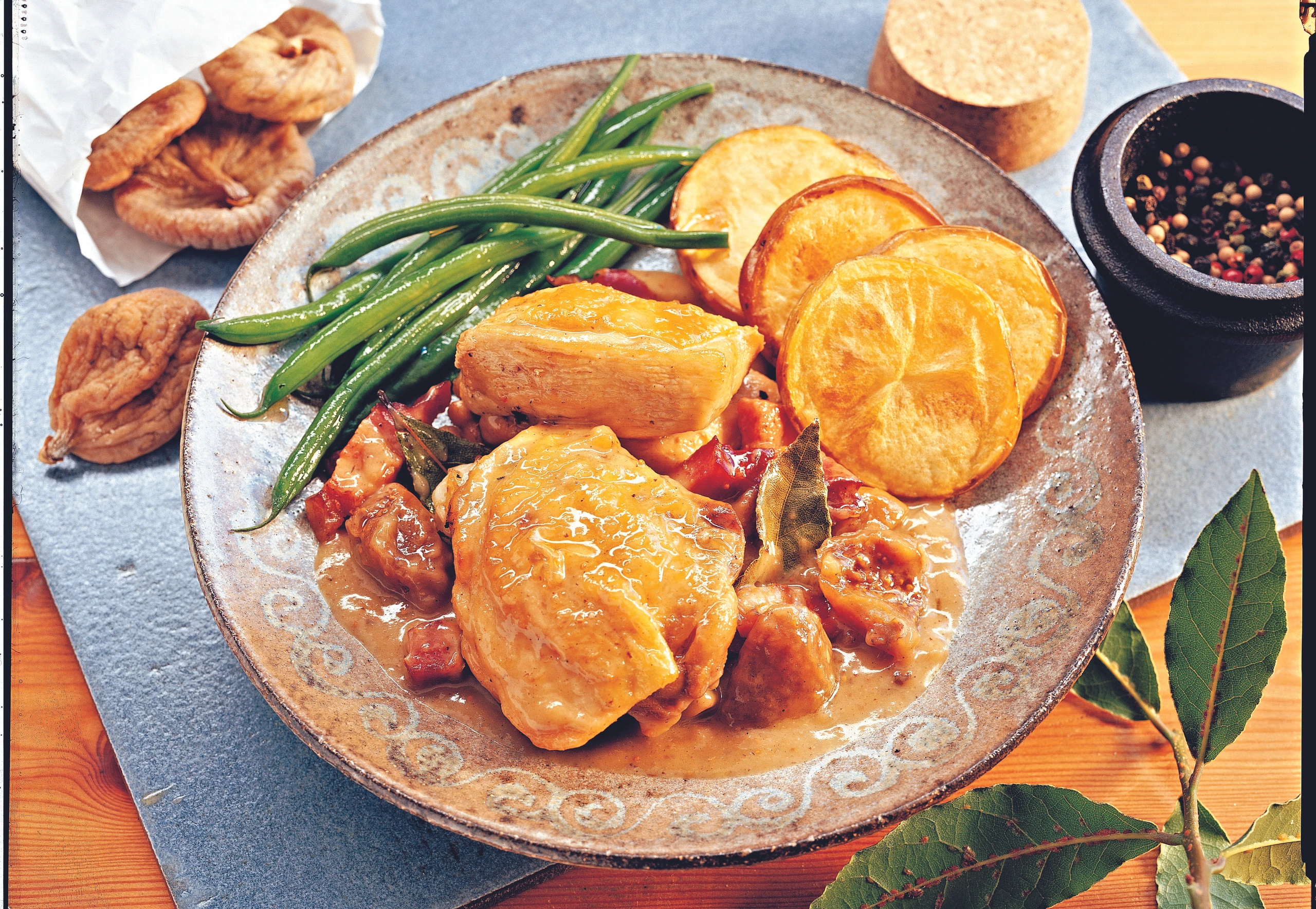 Huhn in 8 Stücke teilen, die Keulen bis zum Knochen einschneiden, das Fleisch auseinander drücken. Hühnerstücke salzen, pfeffern und in Öl scharf anbraten. Speck und Schalotten zugeben, kurz mitrösten. Mit Weißwein ablöschen, mit Suppe aufgießen, Lorbeerblatt zugeben. Topf zudecken und das Huhn ca. 20 Minuten schmoren. Feigen zugeben und weitere 5 Minuten schmoren. Huhn mit den Beilagen anrichten.