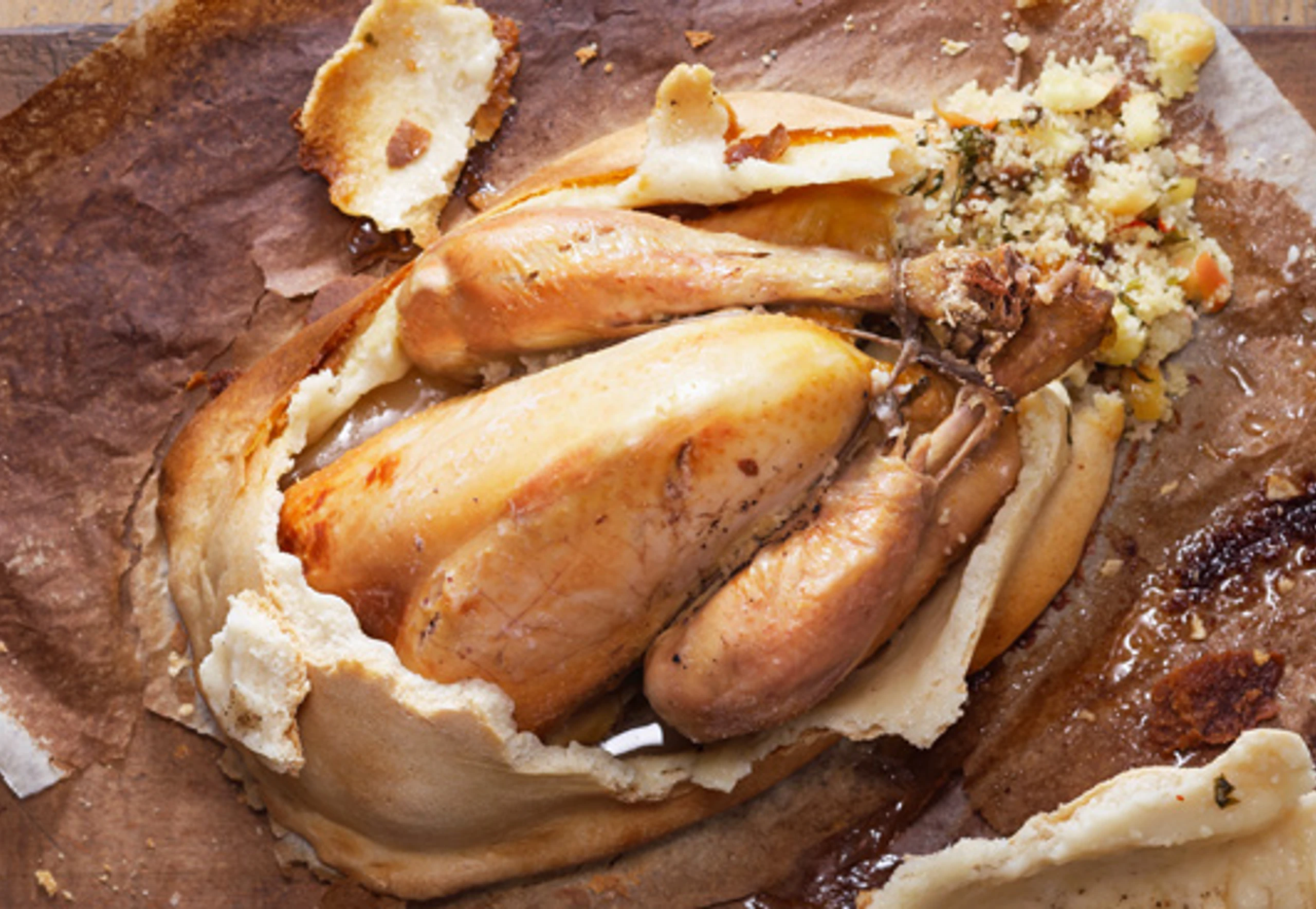 Teig auf einer bemehlten Arbeitsfläche ausrollen (ca. 40 x 50 cm). Huhn in die Mitte setzen, im Teig einschlagen, rundum gut verschließen und auf das Blech legen. An der Oberseite 1 Loch (Ø ca. 4 cm) in den Teig stechen. Huhn im Rohr (untere Schiene) ca. 90 Minuten garen.