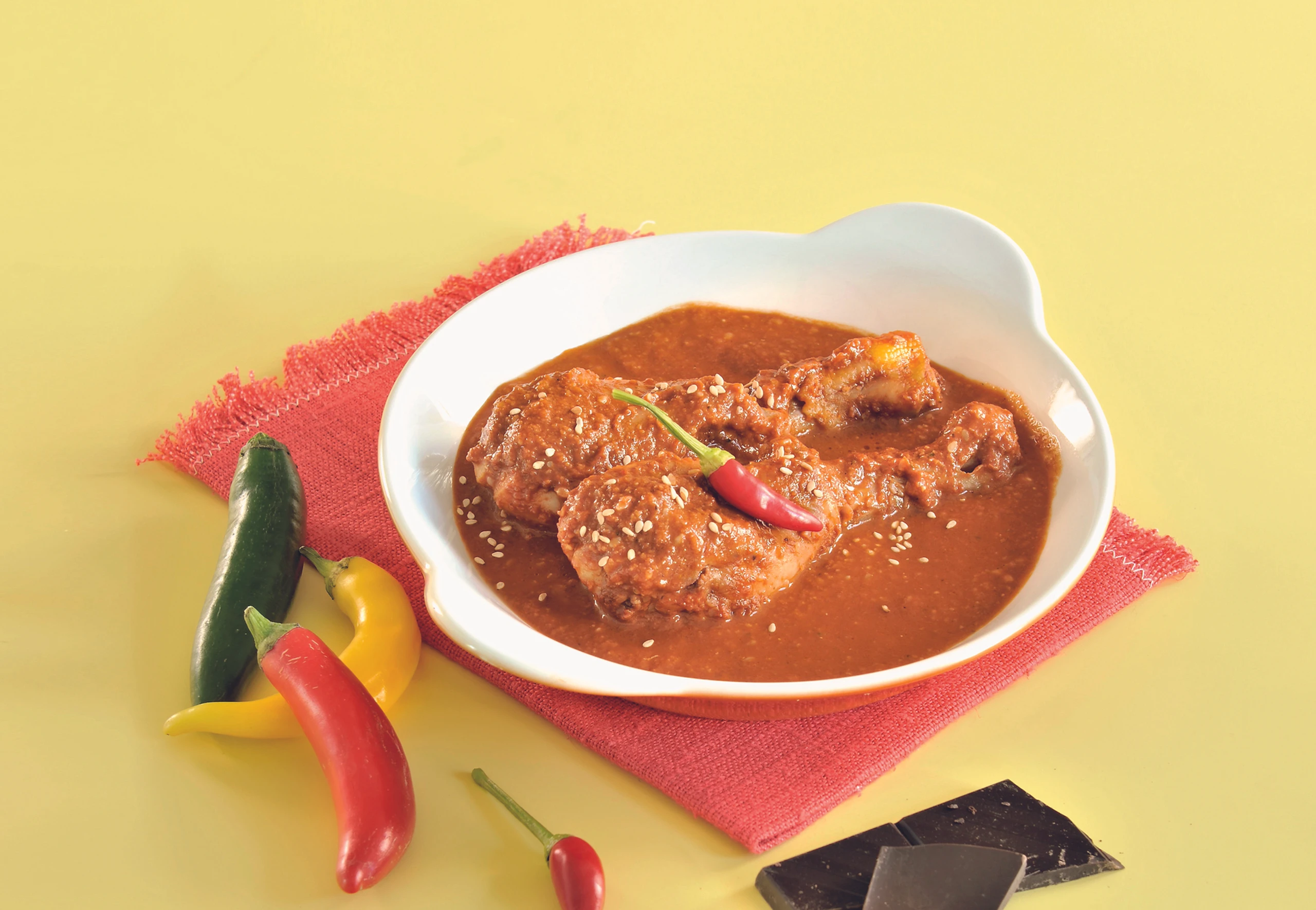 - Rohr auf 180°C vorheizen. In einem flachen Topf 2 EL Öl erhitzen. Zwiebel und Knoblauch darin weich dünsten. Mandeln, Erdnüsse, Sesam und Chili zugeben, kurz anrösten. Paradeiser, Paradeissaft, Rosinen, Schokolade, Zimt und Kräuter unterrühren. Sauce salzen, zudecken und 10 Minuten köcheln. Mit dem Mixstab fein pürieren.
