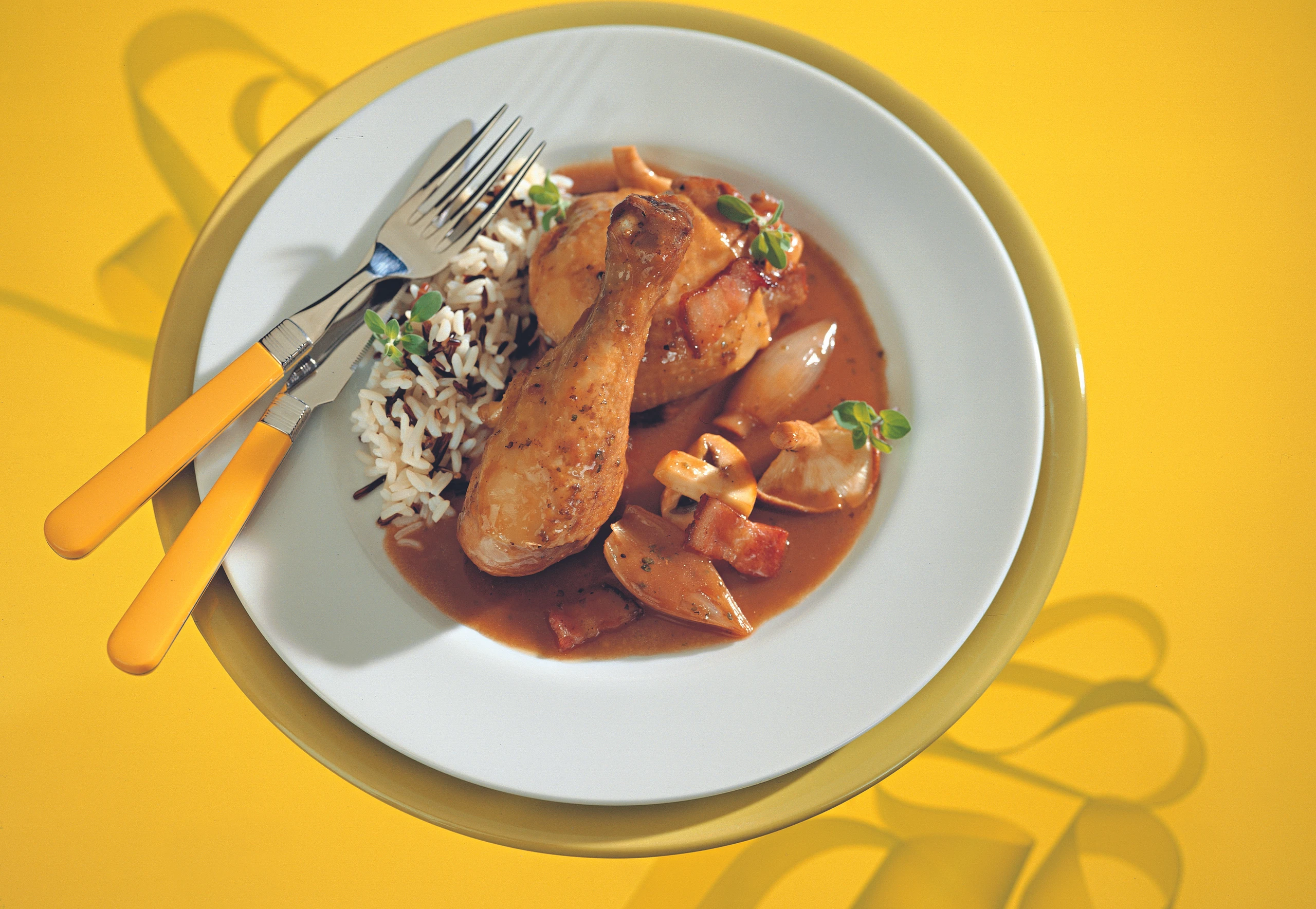 Im Bratrückstand Zwiebeln anschwitzen, mit Wein ablöschen und diesen fast zur Gänze einkochen. Bratensaft zugießen und aufkochen, Hühnerkeulen einlegen. Topf bis auf einen kleinen Spalt zudecken und Keulen auf kleiner Flamme ca. 40 Minuten dünsten. Nach ca. 25 Minuten Garzeit die Hühnerbrust zugeben.