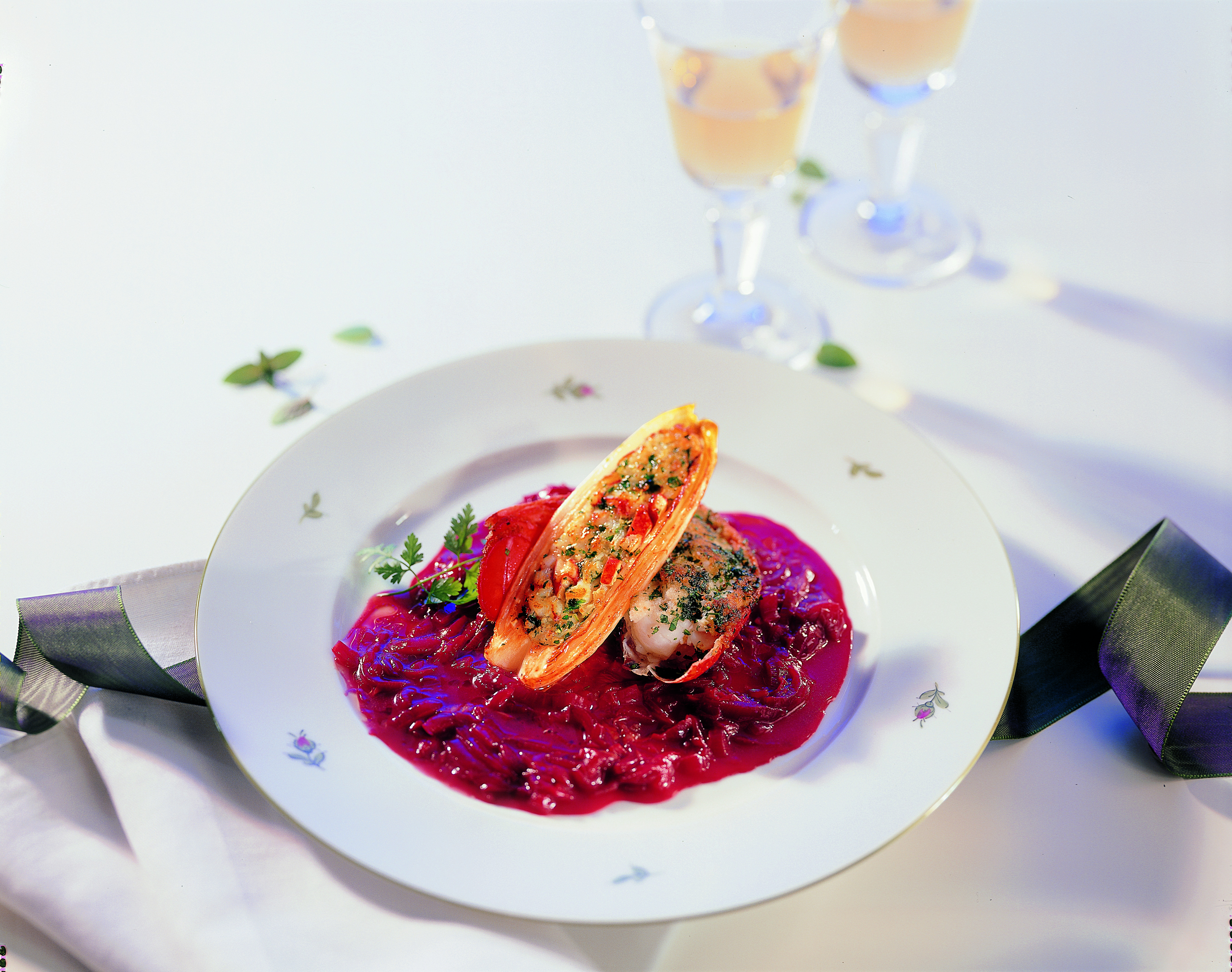 Hummerschwänze und Chicoréehälften mit der Sauce anrichten und rasch servieren.