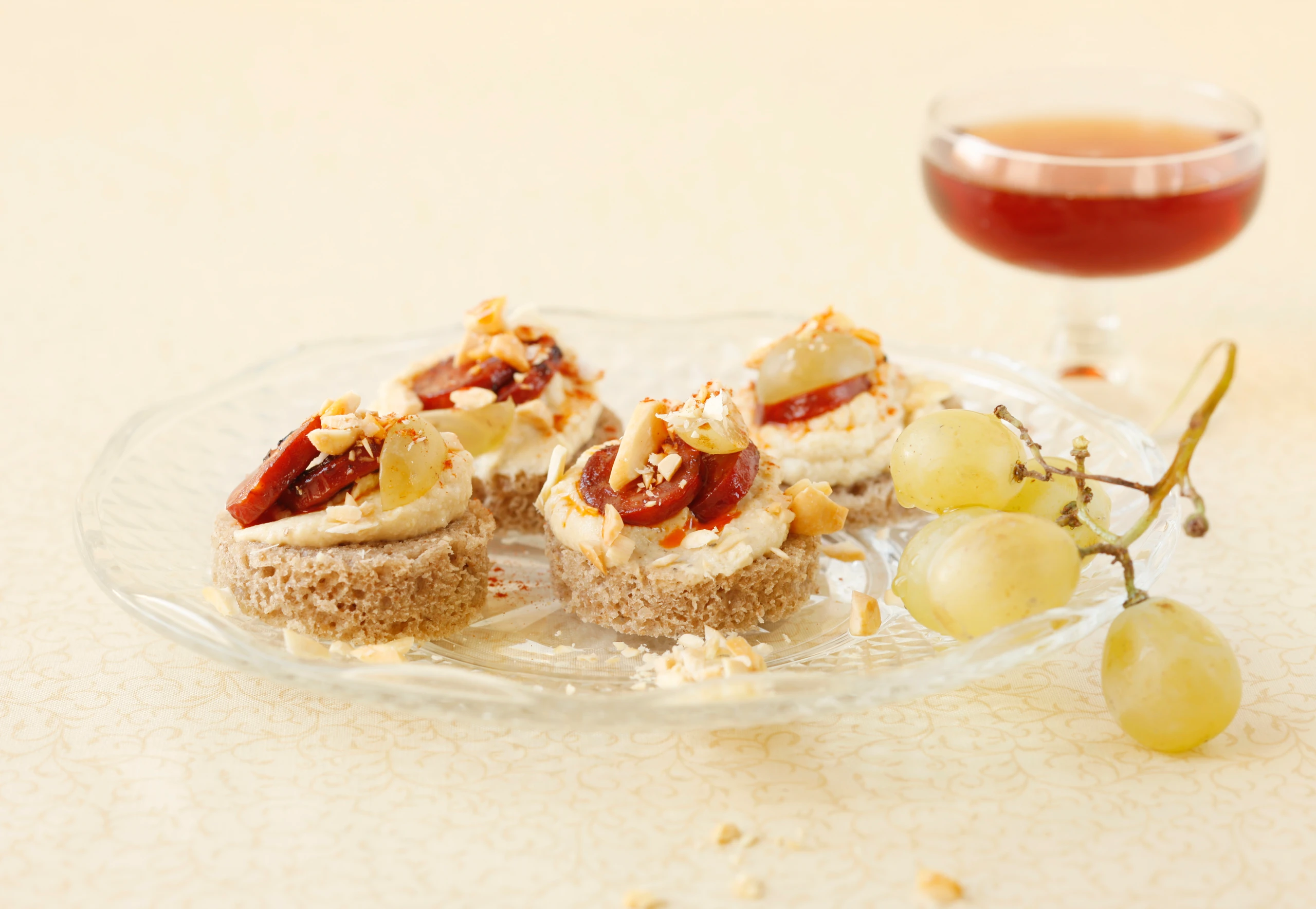 Trauben vierteln. Brote mit Hummus bestreichen, mit Chorizo und Trauben belegen. Canapés mit Salzmandeln und Paprikapulver bestreuen.