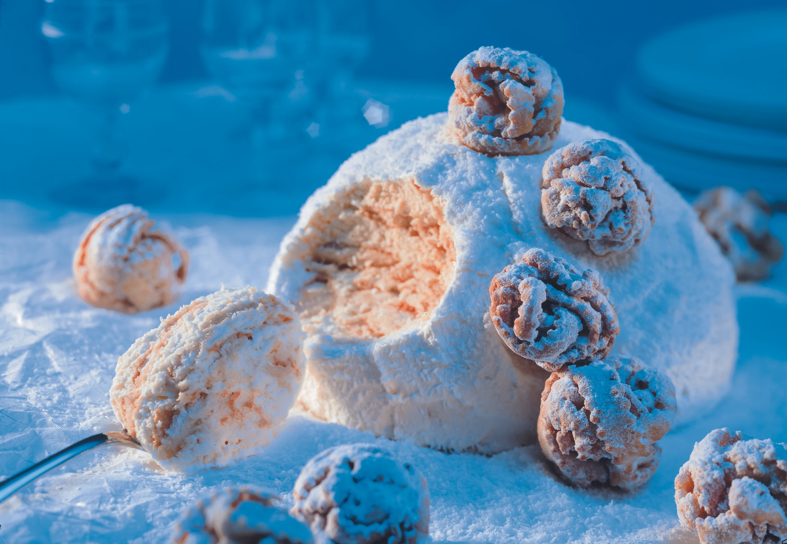 Obers für die Garnitur schlagen. Kuppel auf eine Tortenplatte stürzen, rundum mit Obers bestreichen, mit Kokosette und Staubzucker bestreuen und mit den Schneebällchen (siehe Rezept) dekorieren.