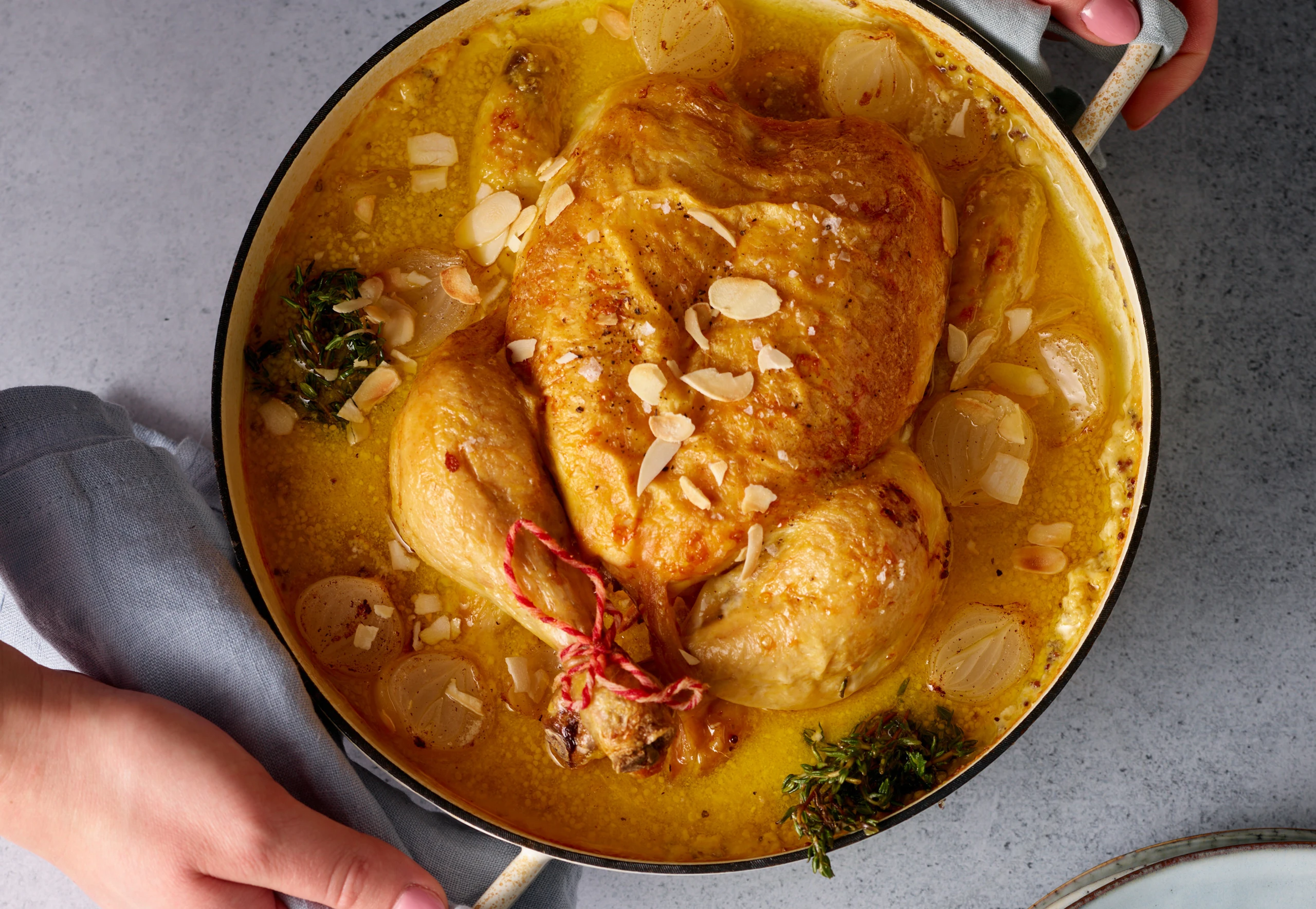Im Rohr (2.Schiene von unten / Gitterrost) ca. 50 Minuten garen. Zwiebeln zugeben und ca. 25 Minuten schmoren. Herausnehmen und mit Mandelblättchen bestreut servieren.