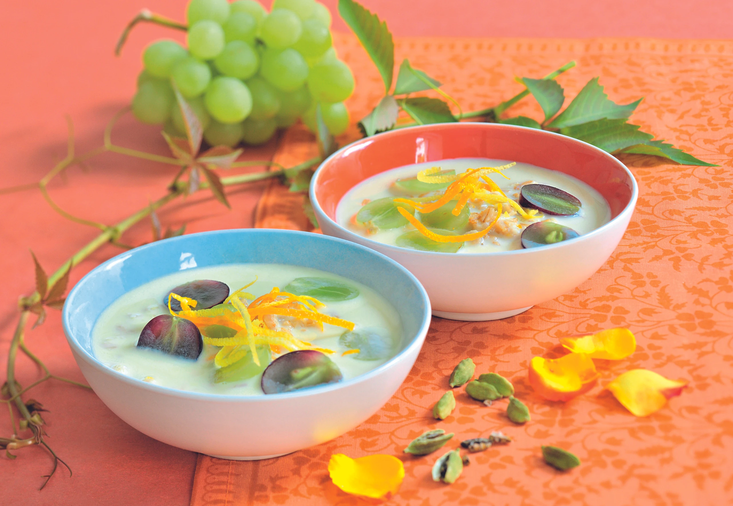 Suppe mit Nüssen, Trauben und Zesten garniert servieren.