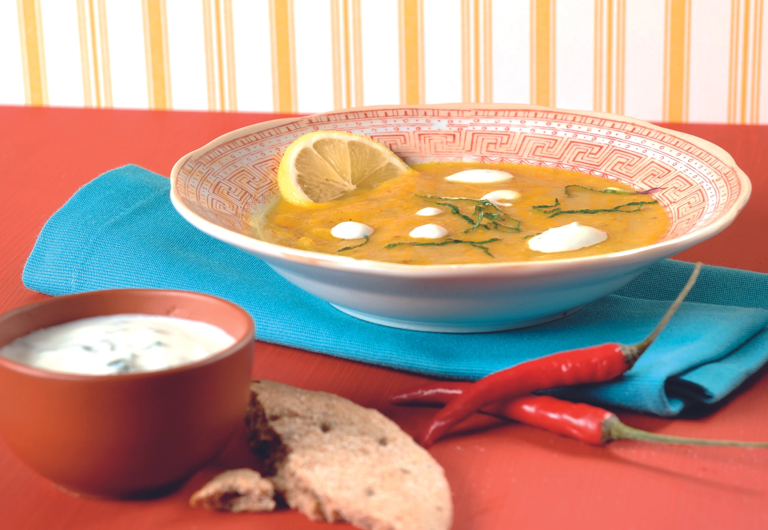 - Öl in einem Topf erhitzen. Zwiebel darin glasig weich dünsten, dann unter Rühren goldgelb braten. Knoblauch und Gewürze zugeben und unter Rühren anrösten. Wasser zugießen, Linsen, Ingwer und Chilis zugeben. Bei schwacher Hitze kochen, bis die Linsen zerfallen (ca. 20 Minuten). Suppenpulver untermischen. Suppe aufkochen. Chilis entfernen. Suppe wenig pürieren (Mixstab), mit Zitronensaft und Salz abschmecken. Spinat-Raita dazu reichen.