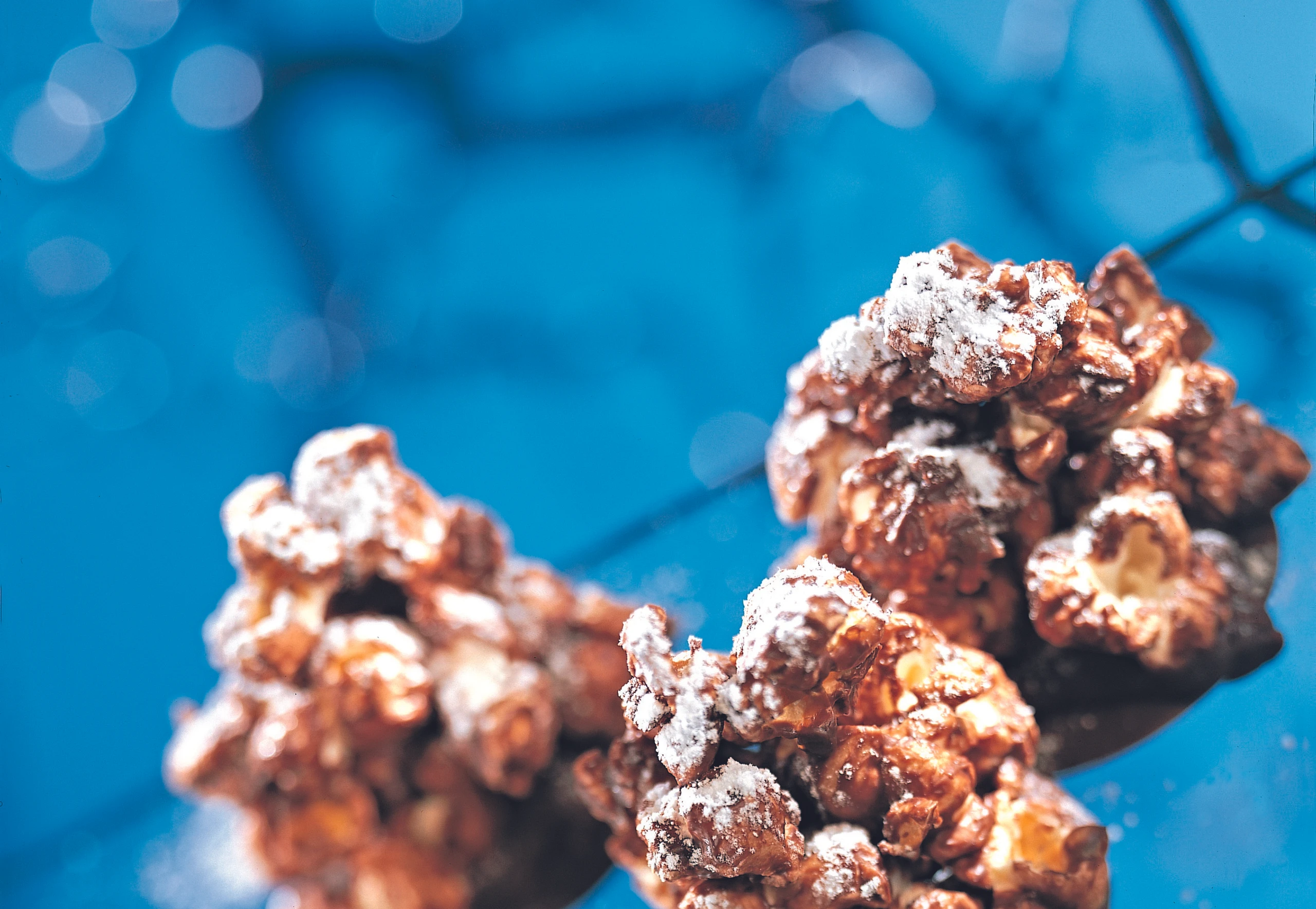 Kandierten Ingwer in kleine Stücke schneiden, mit dem Popcorn vermengen, mit der warm gestellten, restlichen Schokolade übergießen und durchrühren.