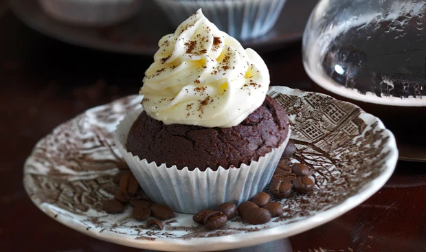 Frosting in einen Dressiersack mit großer Sterntülle füllen. Deckel der Cupcakes leicht abflachen, Frosting darauf dressieren. Cupcakes mit 40 g Schokospänen und Kaffeepulver garnieren.