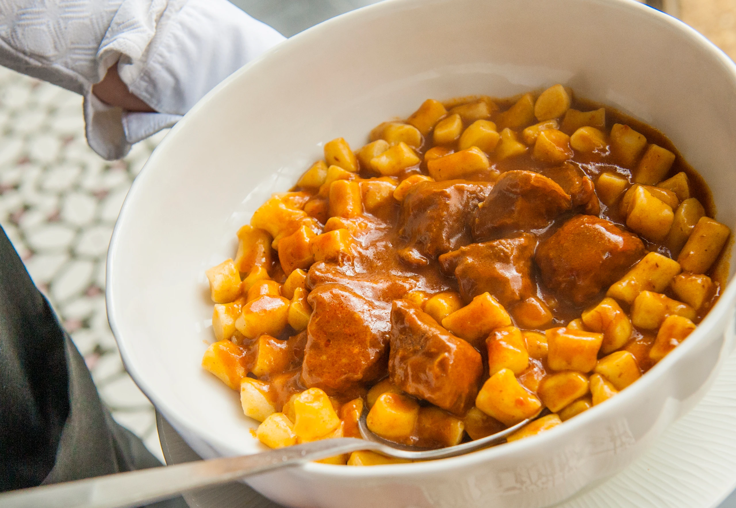 Rindfleisch in 3 cm große Würfel schneiden. Zwiebeln schälen und grob hacken. Öl in einem großen Topf erhitzen, Zwiebeln darin bei mittlerer Hitze goldbraun rösten. Fleisch zugeben und scharf anbraten. Mit Rindsuppe aufgießen, Paradeiser zugeben, mit Salz, Pfeffer, Salbei, Rosmarin, Knoblauch und Petersilie würzen. Eintopf mit Rotwein aufgießen und mindestens 3 Stunden köcheln.