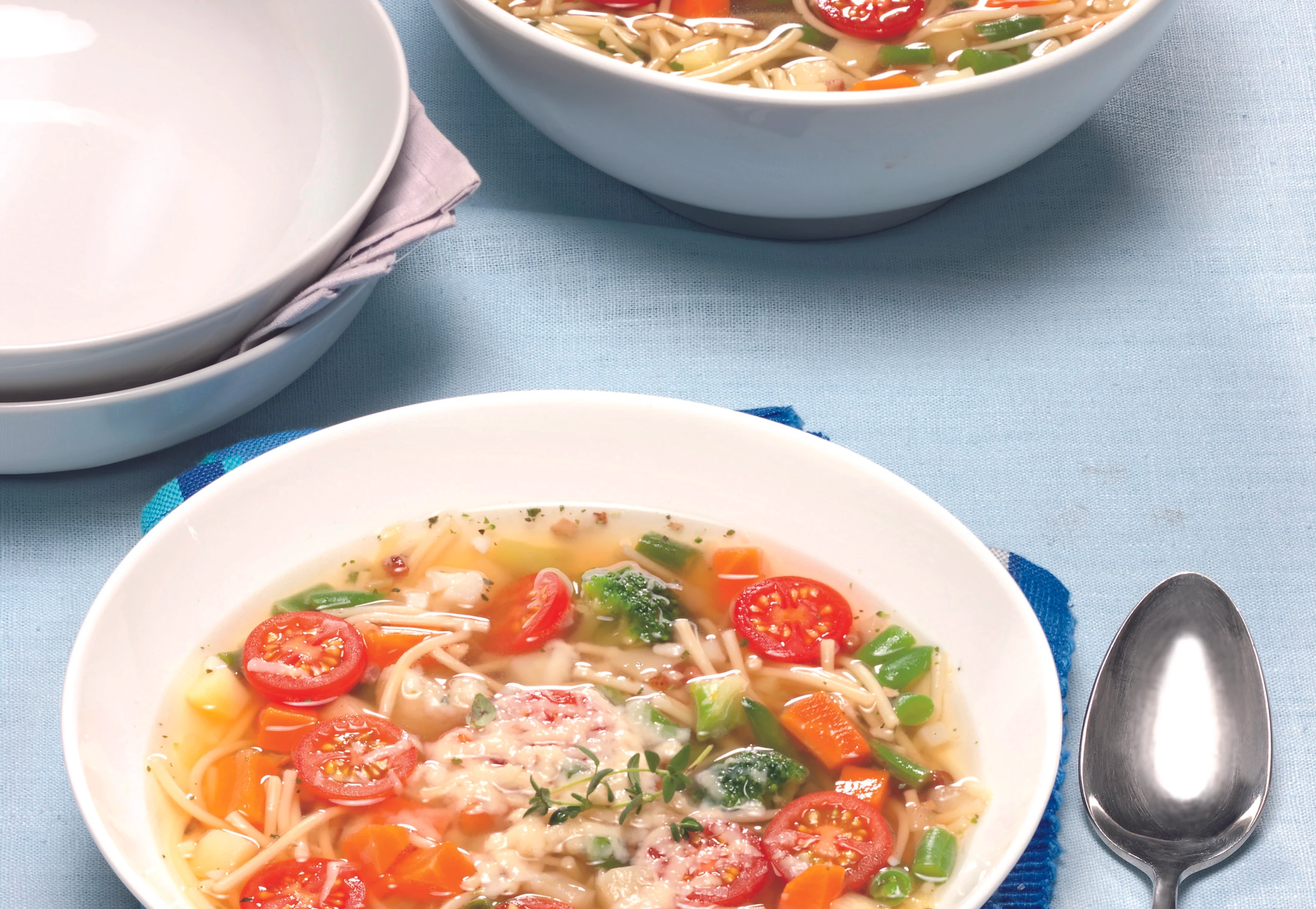 Paradeiser halbieren oder vierteln. Spaghetti in kleine Stücke brechen, mit Paradeisern und Kräutern ca. 5 Minuten vor Ende der Garzeit des Gemüses in die Suppe geben.