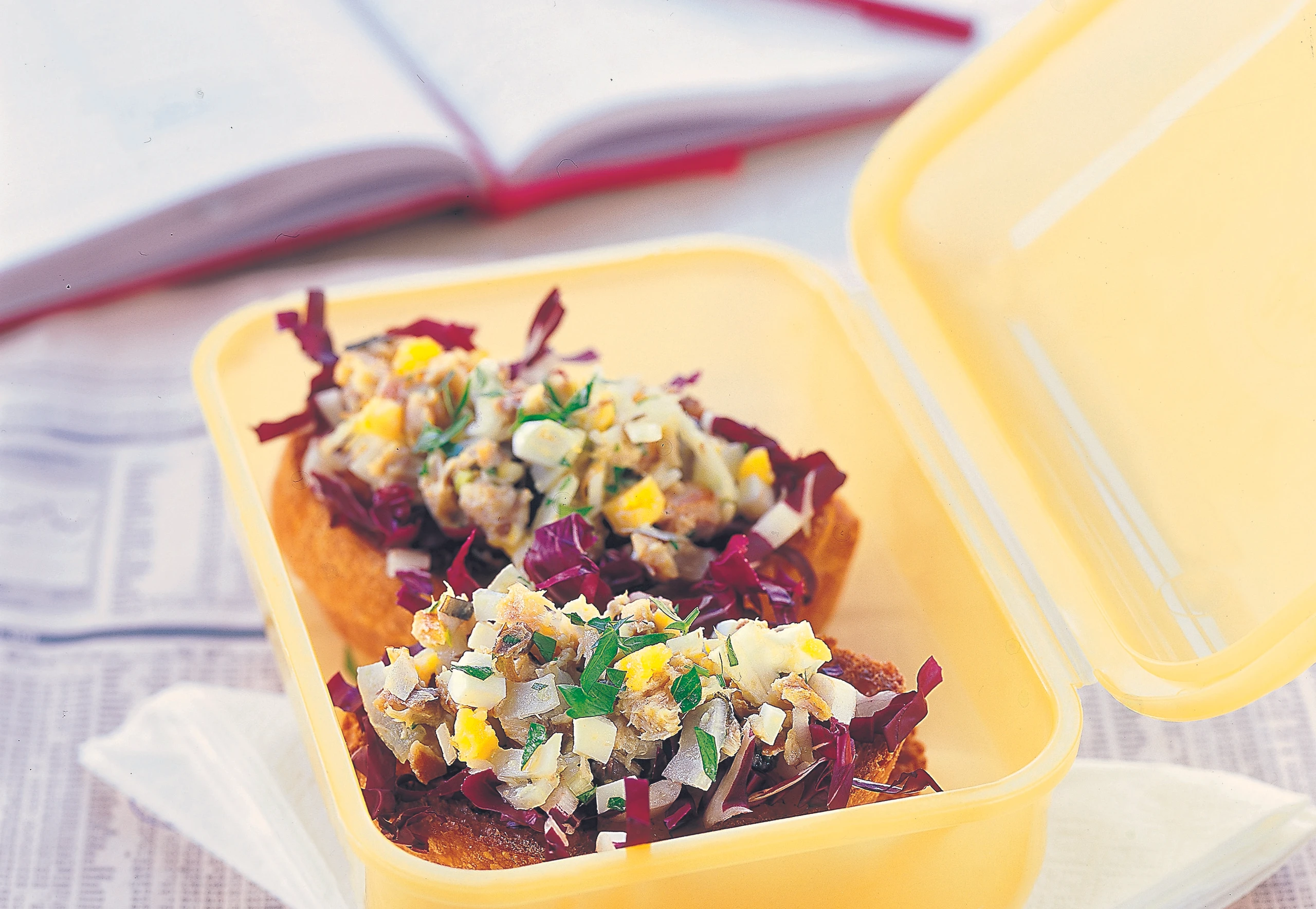 Brotscheiben, Tatar und Radicchio getrennt in Aufbewahrungsboxen geben und ins Büro mitnehmen.