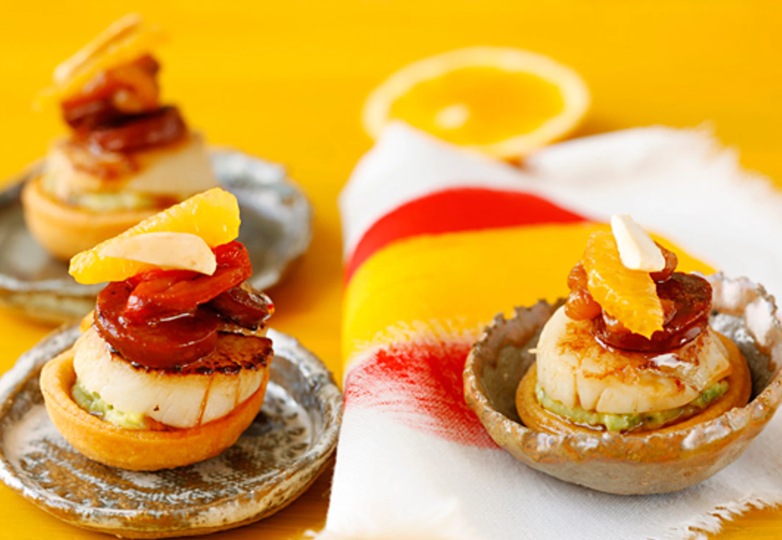 - Für die Creme Avocado halbieren und entkernen. Fruchtfleisch aus der Schale lösen, zerdrücken und mit Hummus vermischen. Creme auf den Böden verteilen. Muscheln horizontal halbieren, auf die Creme legen, mit Chorizo, marinierten Paprika, Salzmandeln und Orangenfilets garnieren.