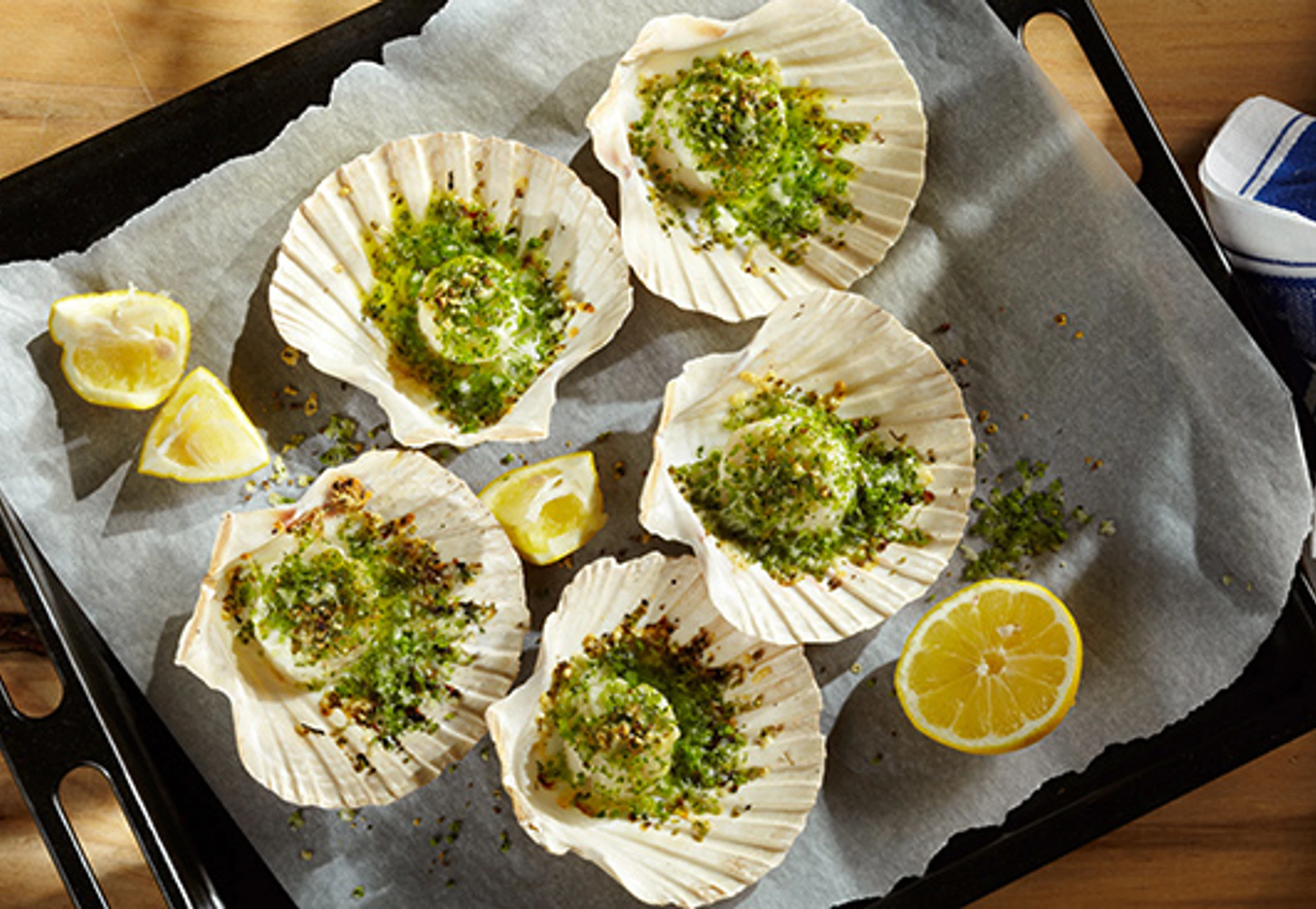 Rohr auf 180°C vorheizen. Muschelschalen waschen und eventuell abbürsten. Muschelfleisch und Corail trennen, waschen und mit Küchenpapier trockentupfen.
