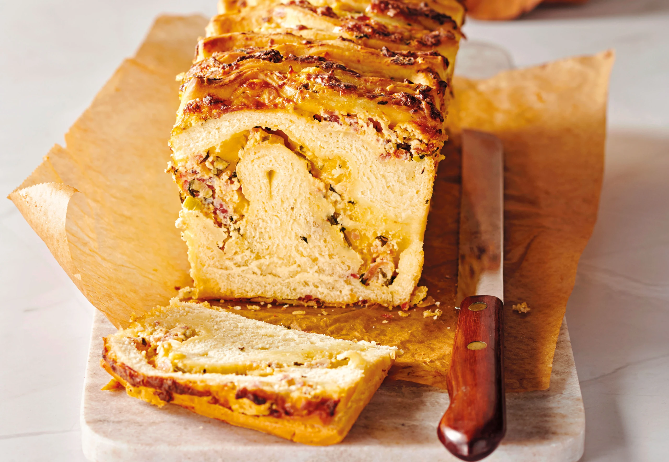 Teig mit dem Backpapier ausrollen und mit der Käse-Speck-Mischung bestreichen. Teig der Länge nach in 3 Streifen und in der Breite in 4 Streifen schneiden, sodass 12 Rechtecke entstehen. In die Kastenform schlichten. Teigrechtecke ein wenig auseinanderzupfen.