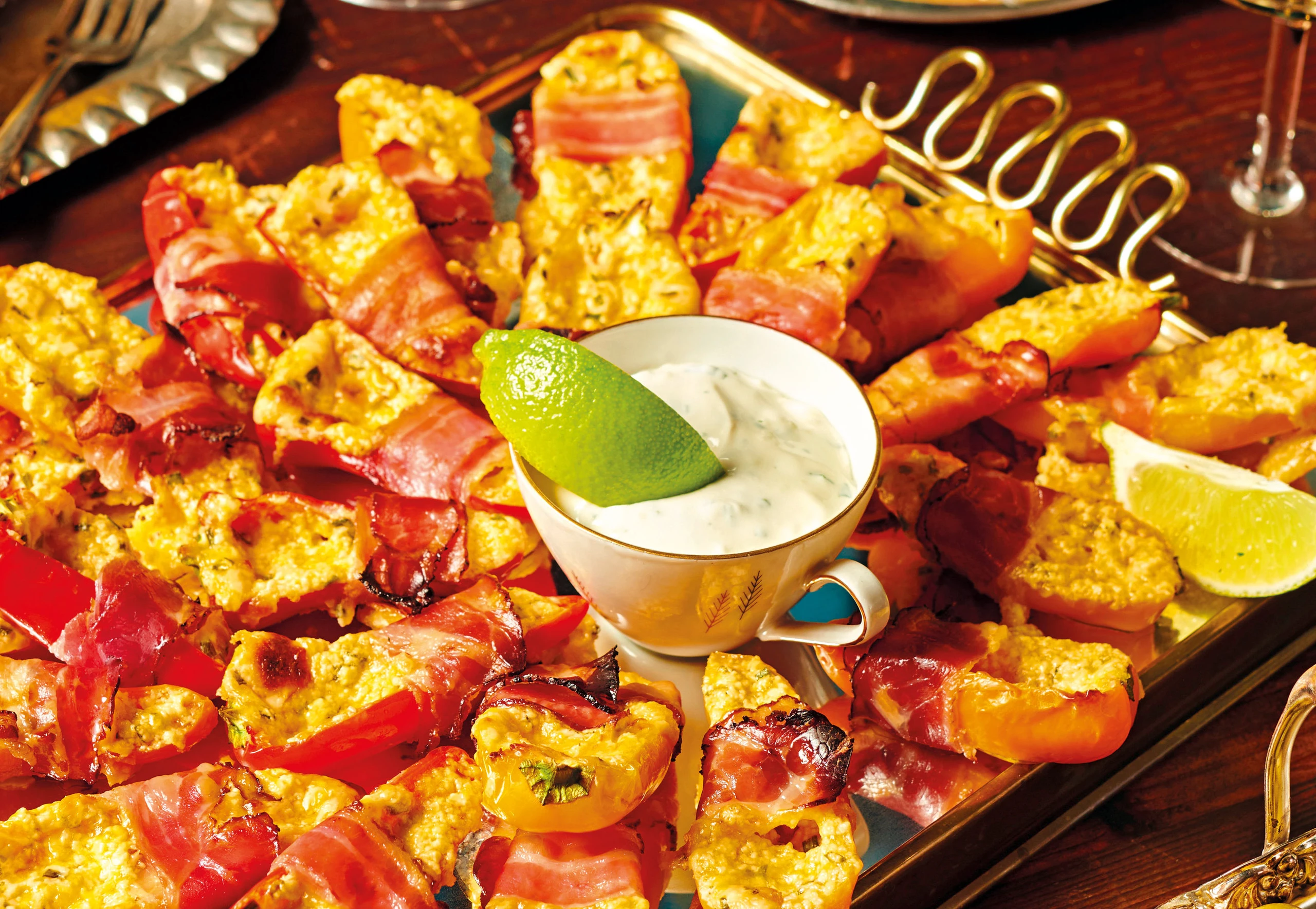Jalapeños mit der Frischkäsecreme füllen, mit Speck umwickeln und auf das Blech legen. Im Rohr (mittlere Schiene) ca. 25 Minuten backen, bis der Käse geschmolzen und der Speck knusprig ist.