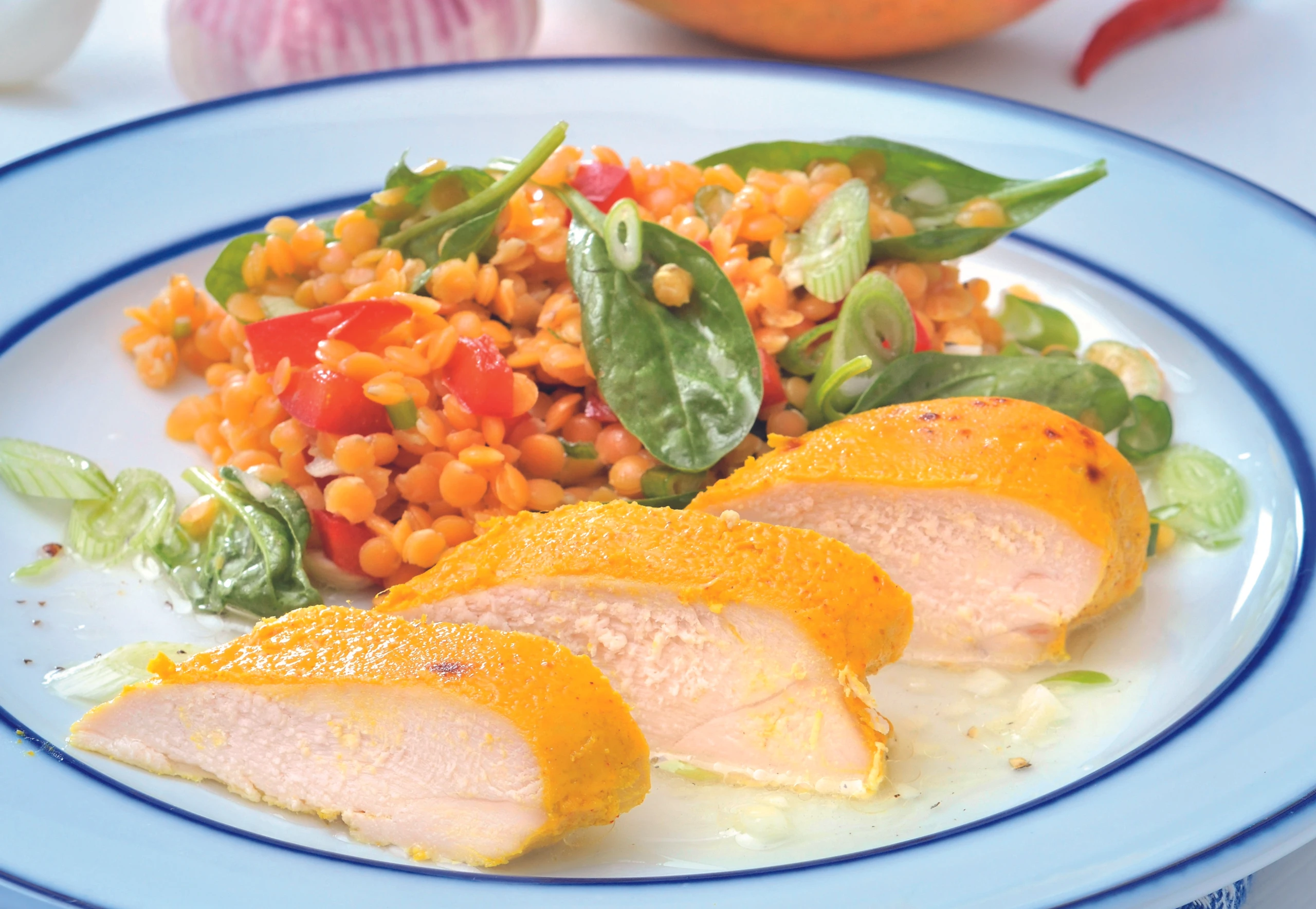 Hühnerfilets herausnehmen, in Scheiben schneiden und mit dem Linsensalat anrichten.