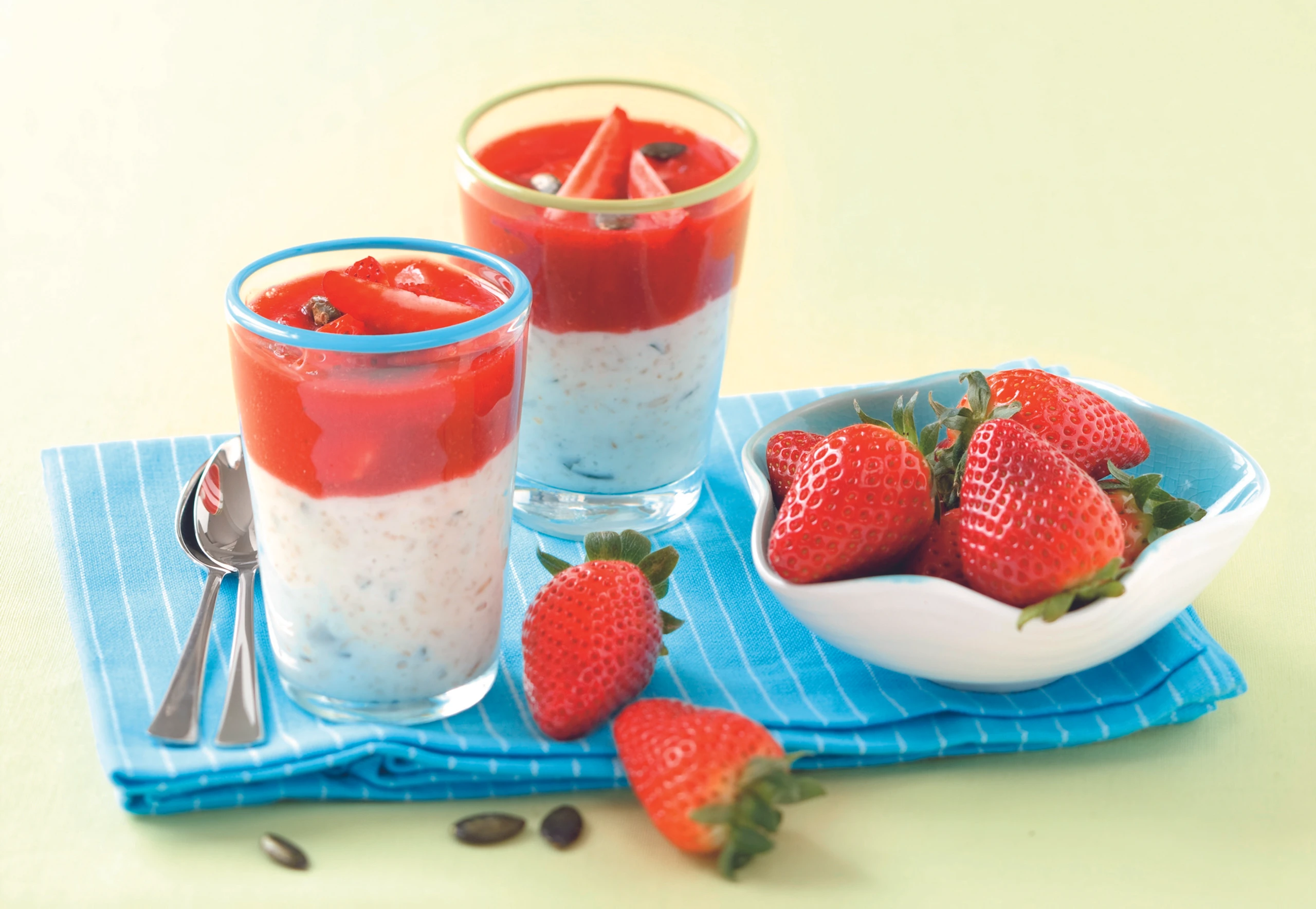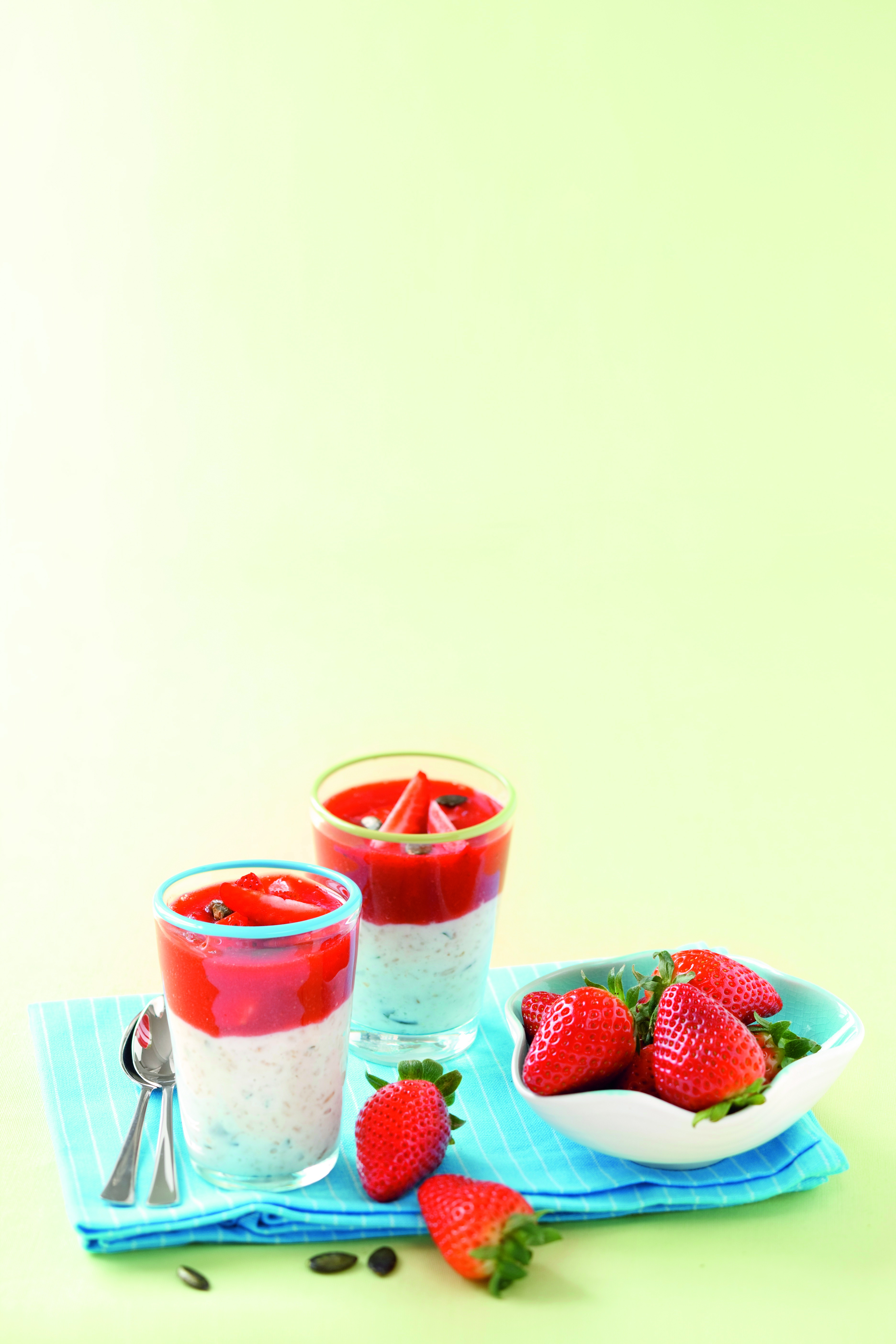 Erdbeeren putzen und in Stücke schneiden. 400 g davon mit Orangensaft und Zucker mit dem Mixstab fein pürieren. Porridge in Gläsern verteilen, Erdbeersauce daraufgießen, mit Erdbeerstücken und übrigen Kürbiskernen garnieren.