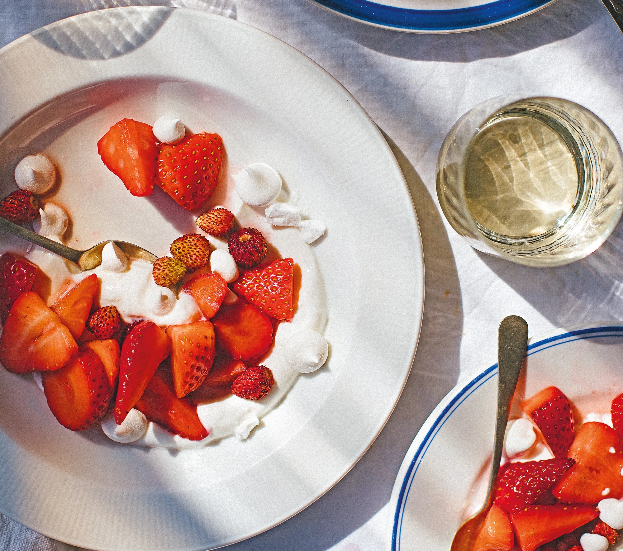 Joghurtcreme auf kleinen Tellern oder in Schüsseln anrichten, mit Erdbeeren und Baiser garnieren.