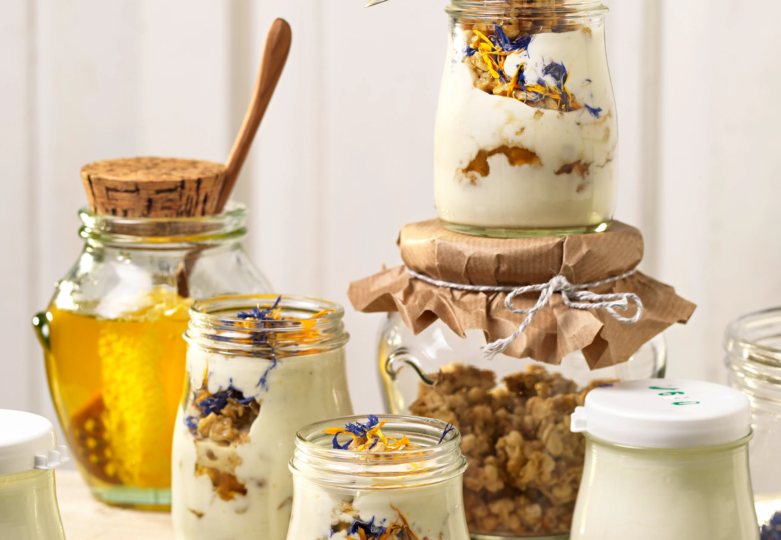 - Creme, Müsli, Honig und Blüten abwechselnd in die Gläser füllen.