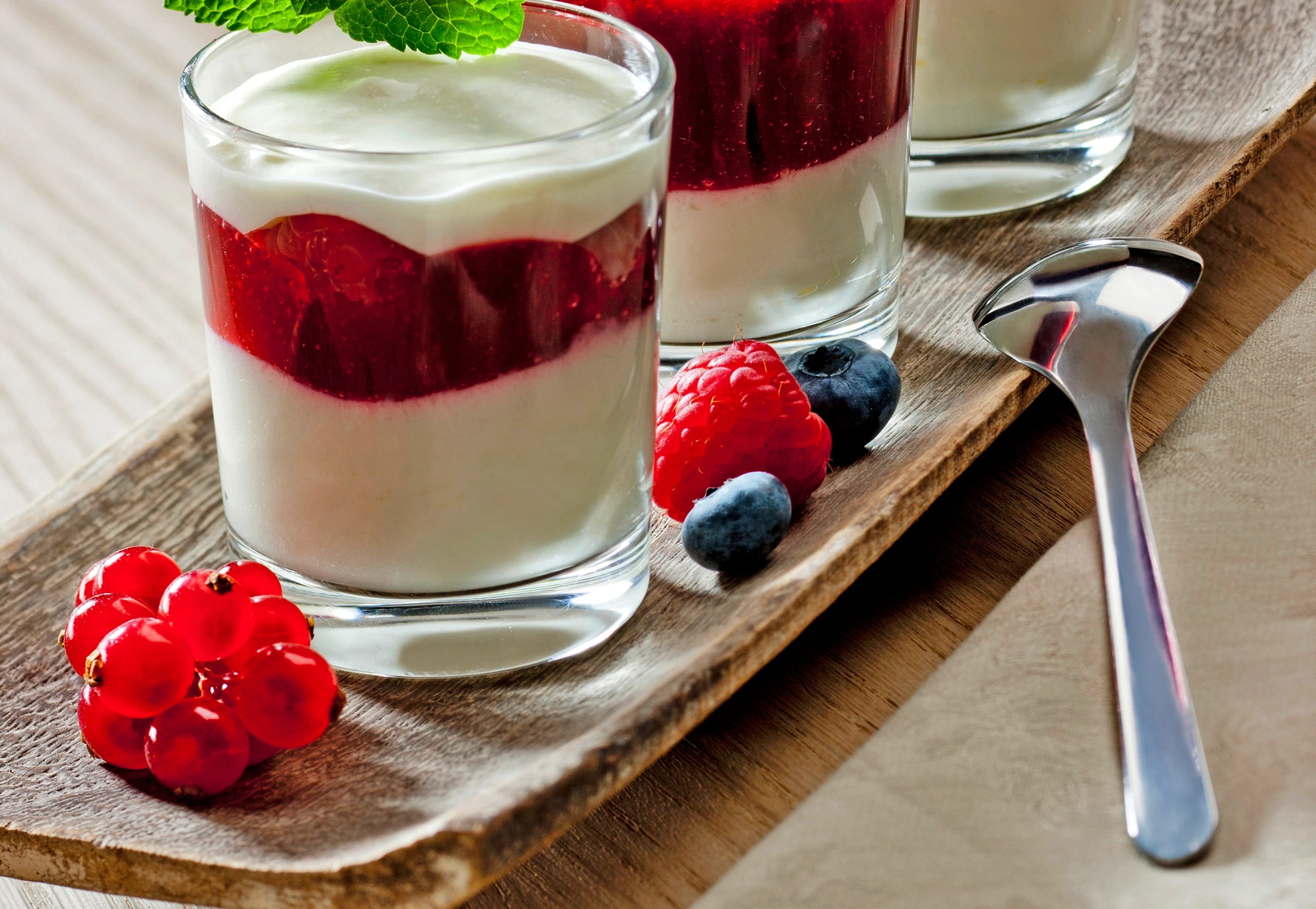 - Joghurtmousse und Beerengelee abwechselnd in Gläser füllen und für mindestens 2 Stunden kühl stellen, mit Beeren und Minze garniert servieren.