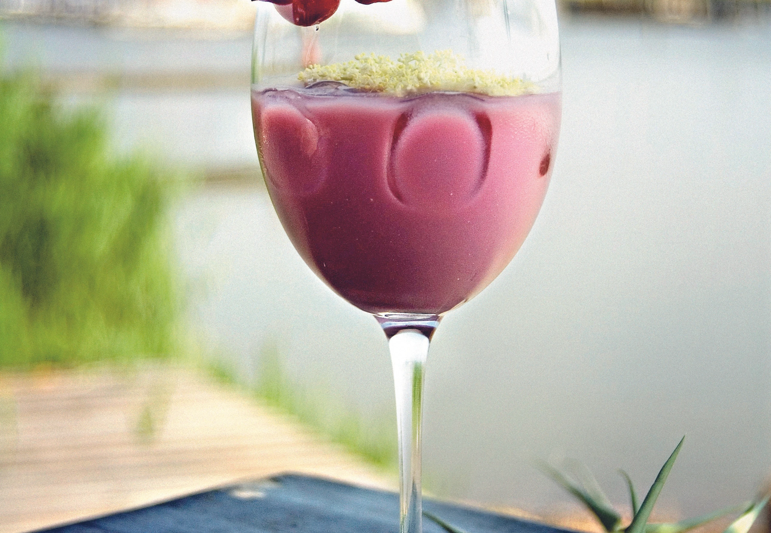 Glasrand mit Zitrone einreiben und in Zucker tauchen. Buttermilch und Johannisbeernektar mischen, mit einigen Minze-Eiswürfeln in die Gläser füllen. Eventuell mit Kirschen, Ribiseln und/oder Holunderblüten garnieren.
